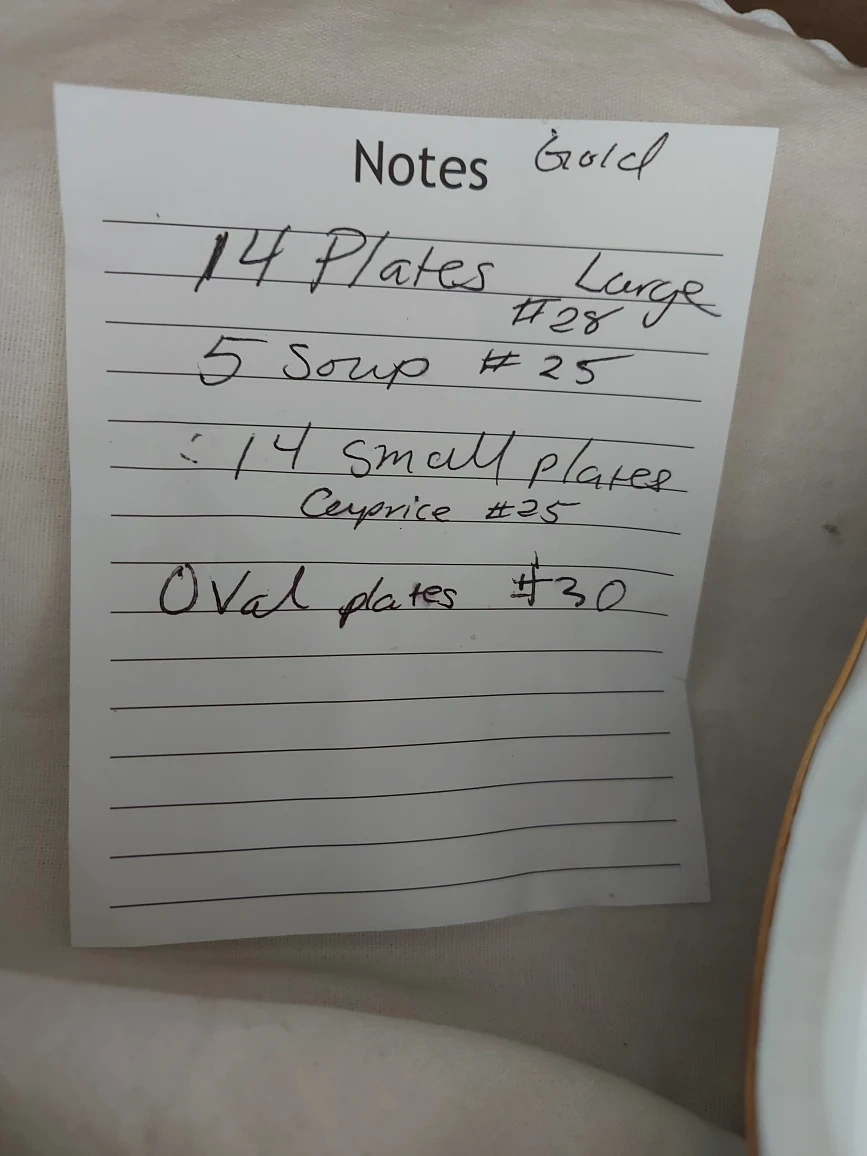 Buy & SellPlates - 14 Large, 5 Soup, 14 Small, OvalPlates - 14 Large, 5 Soup, 14 Small, Oval$40Selling a collection of plates. There are 14 large plates, 5 soup plates, 14 small plates, and some oval plates. They have a gold trim.ConditionGoodWHERE TO MEETCheck LocationView MapSELLERverifiedmariaOakwood Village842 reviews0 chats·0 favorites·5 views