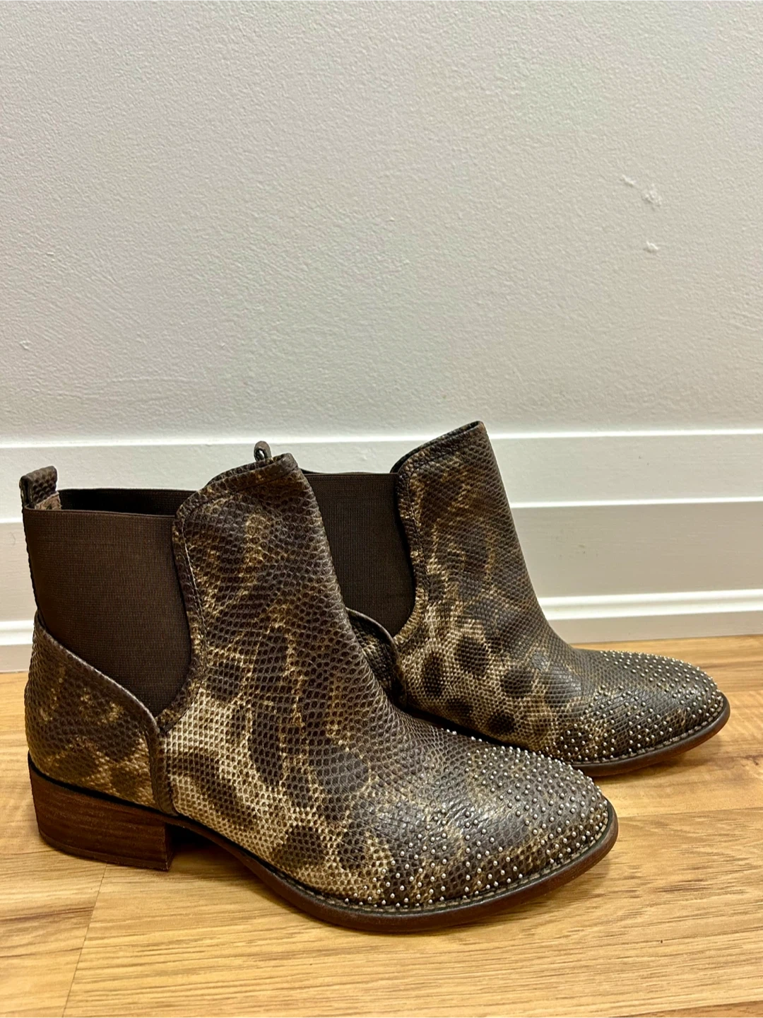 Selling a pair of studded ankle boots in a size 8. They have a unique snakeskin-like pattern and are in good condition. Great for adding a bit of edge to any outfit!