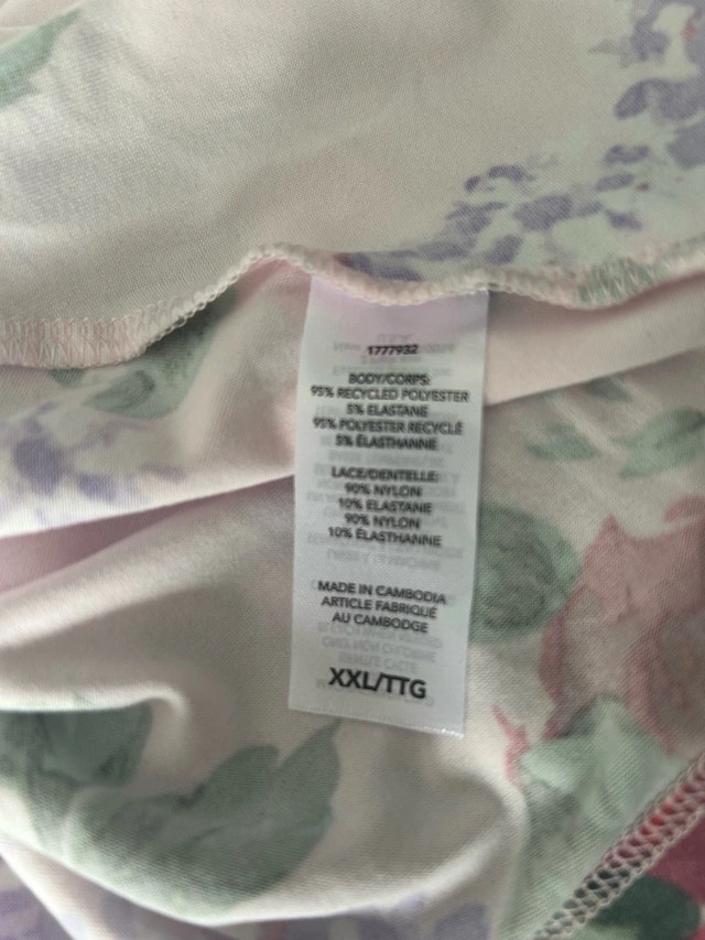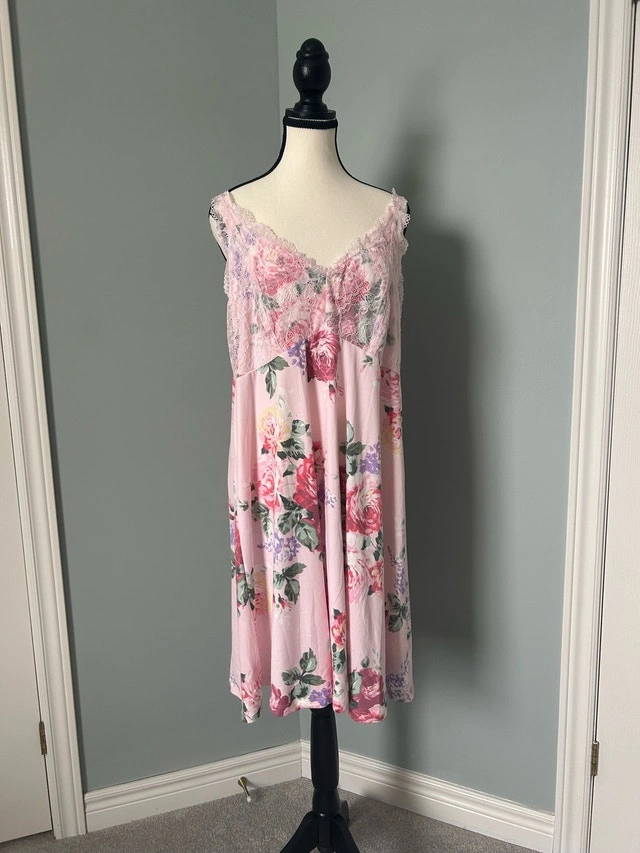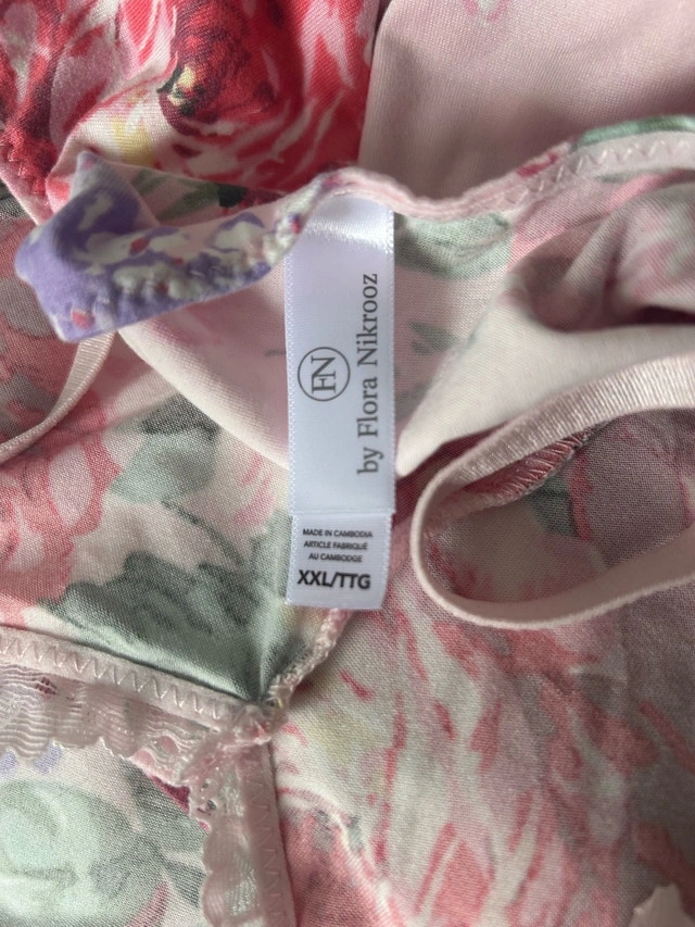 This is a Flora Nikrooz nightgown in size XXL/TTG. It is pink with a floral pattern and lace trim. The body is made of 95% recycled polyester and 5% elastane. The lace is made of 90% nylon and 10% elastane. It is in good condition.