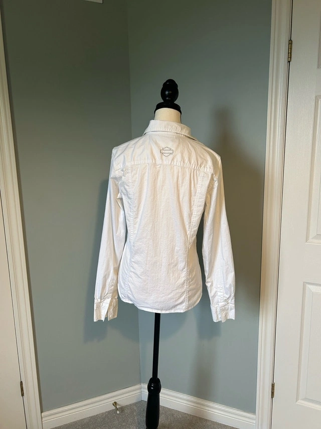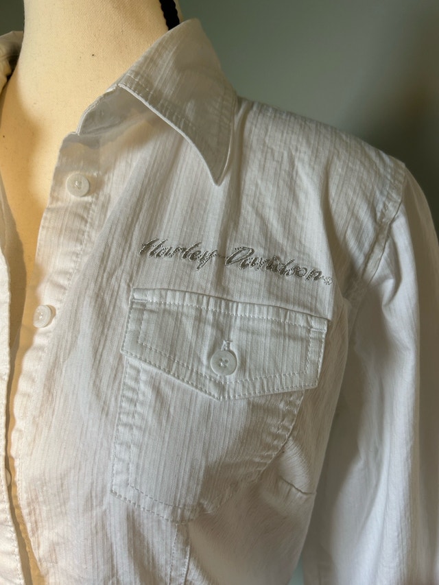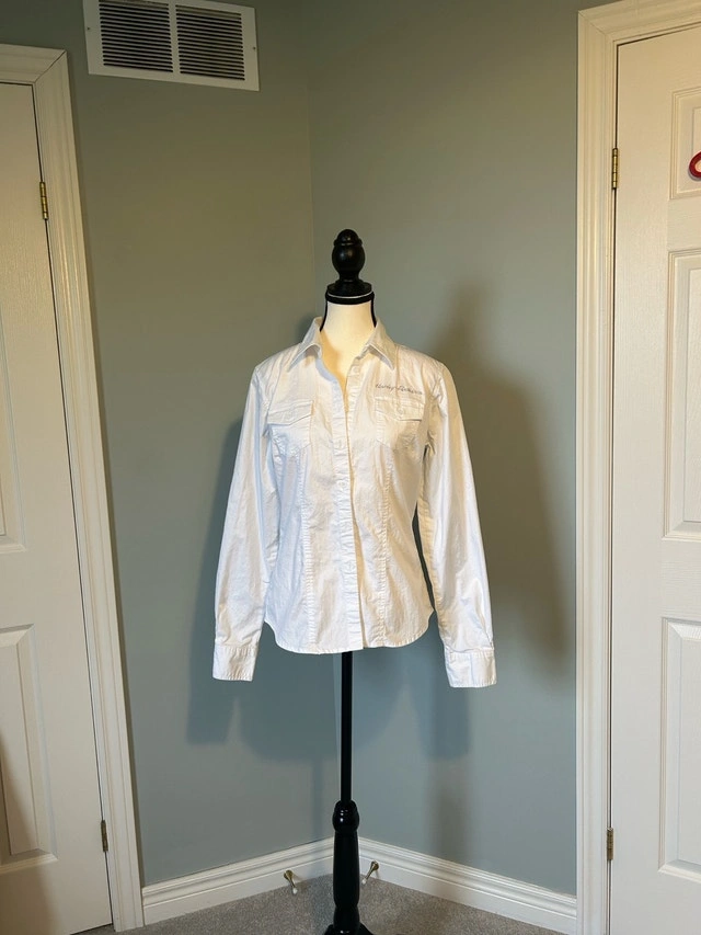 Harley-Davidson Women’s Long Sleeve Button-Up Shirt – Size Medium. Pit to pit 20.5 inches, sleeve length 25 inches, length 24 inches. Classic and timeless white Harley-Davidson button-up shirt featuring embroidered logo detail on the chest. Made from soft, breathable cotton for a comfortable fit. Perfect for layering or wearing on its own for a clean, casual look.