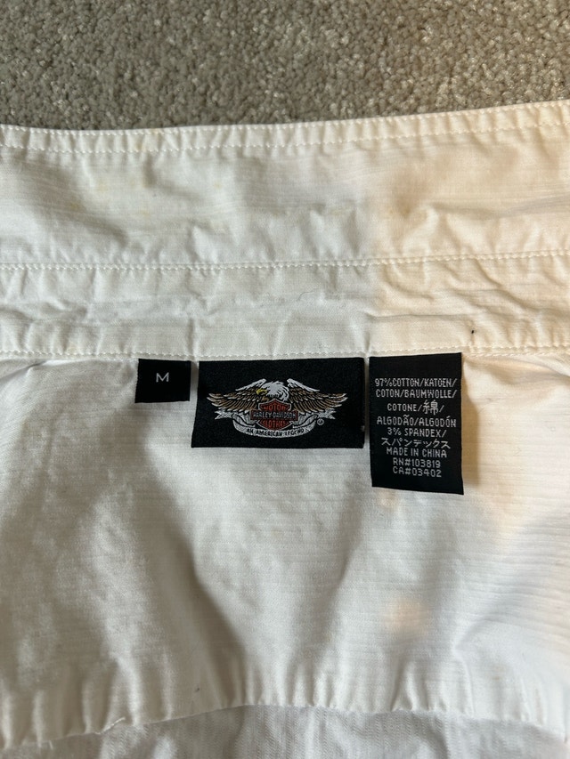 Condition: Gently used. There are small light stains on the collar and one small stain on the lower left back—these may come out with a good wash. Priced accordingly. A great addition for Harley fans or anyone who loves a crisp, classic button-up style!