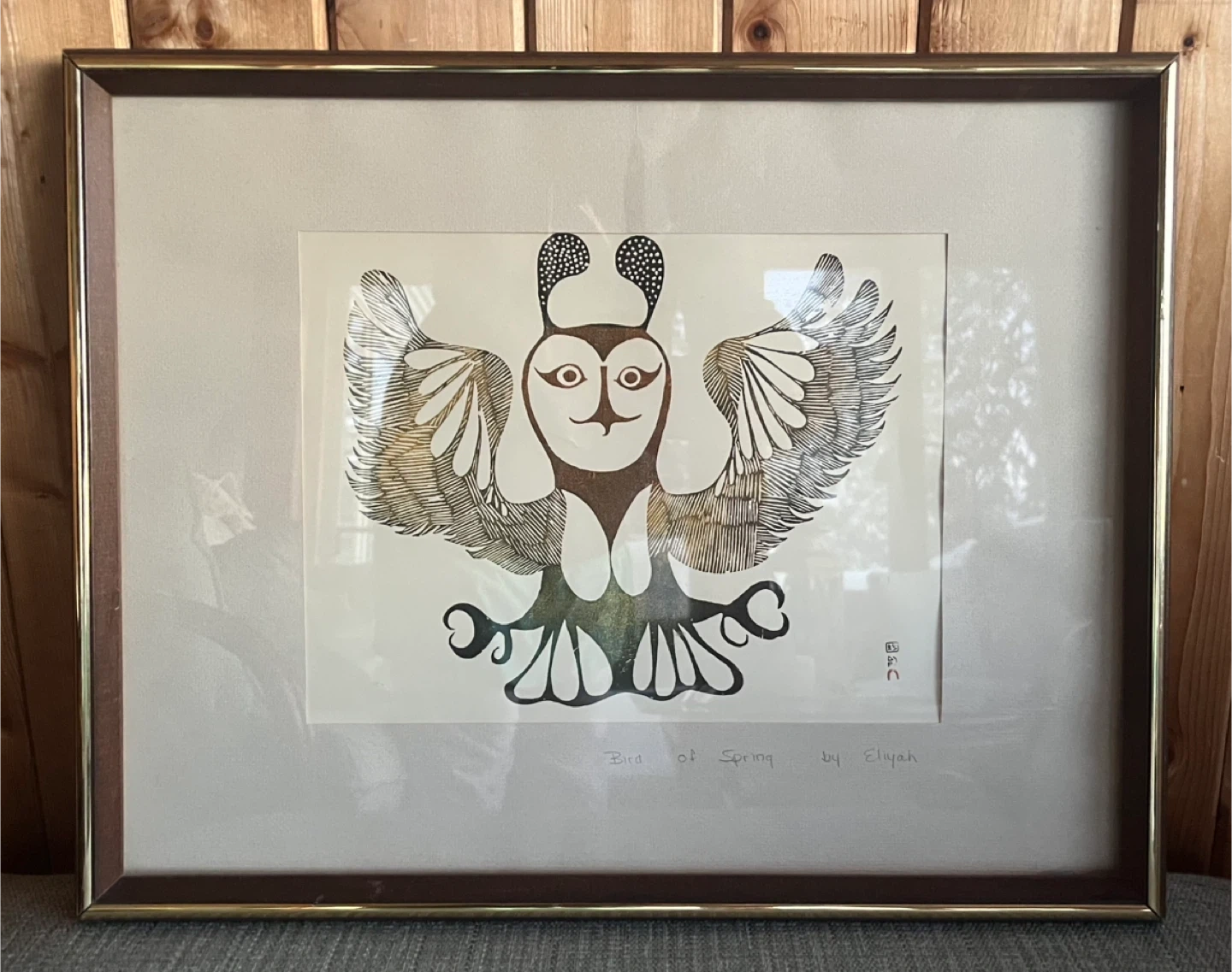 Selling a framed print titled "Bird of Spring" by Elijah. The frame is a gold colour and the print features a unique owl design. It's a lovely piece of art that would look great in any home. Perfect for the Holidays!