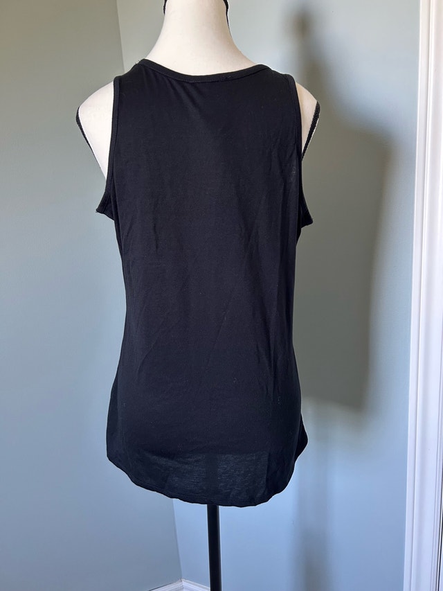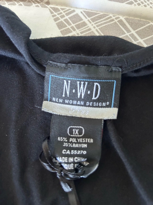 This is a stylish NWD black tank top, size 1X, featuring a charming ruffle detail, perfect for adding a touch of elegance to any outfit. Key Features: * Brand: NWD (New Woman Design) * Size: 1X * Colour: Black * Design: Ruffle front * Material: 65% Polyester, 35% Rayon