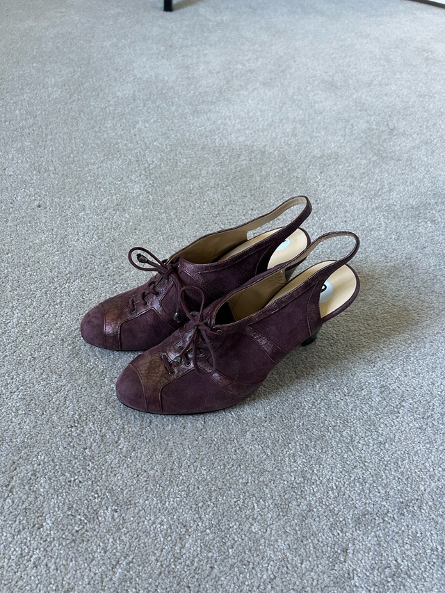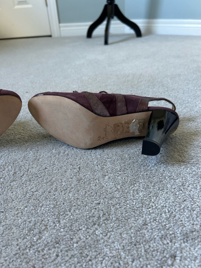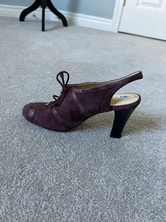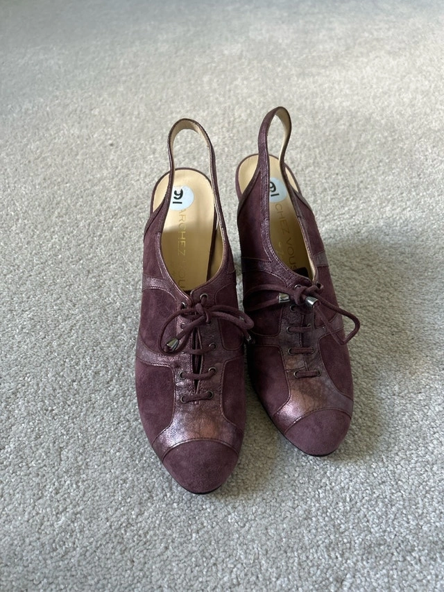These are Marchez Vous slingback oxford heels — a stylish and fairly rare designer shoe line founded by actress Eva Longoria. The brand focused on chic, comfortable, Italian-made footwear that blends sophistication with wearability. Marchez Vous Burgundy Suede & Leather Slingback Oxford Heels – Size 9 Beautifully crafted Marchez Vous heels in a rich burgundy wine tone. These unique shoes feature a lace-up oxford front with a stylish slingback strap, blending sophistication and comfort. Made from premium suede with metallic leather accents, they’re perfect for both work and evening wear. Heels: 3.5 inches Details: • Brand: Marchez Vous • Color: Burgundy / Wine • Material: Suede and metallic leather • Style: Slingback oxford heel • Rounded toe, lace-up front • Lightly cushioned insole for comfort • Very good condition – gently worn, clean and ready to wear Only mark to note is on the inside external body of the right shoe there is a slightly darker rectangular blemish - noted in a picture ✨ Chic, comfortable, and rare to find — perfect for fall outfits or pairing with dresses and trousers!