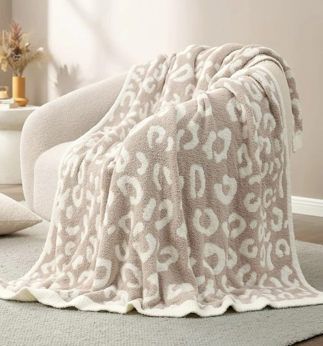 Wrap yourself in the luxurious comfort of this Snuggle Sac throw blanket, featuring a stylish taupe and cream leopard print. This blanket is brand new, still in its original packaging, and has never been opened.