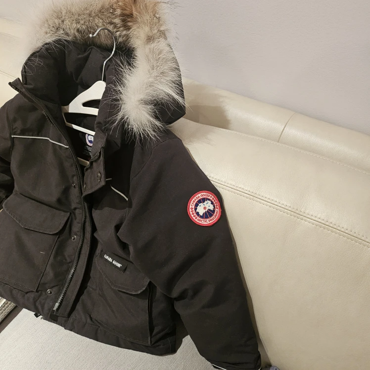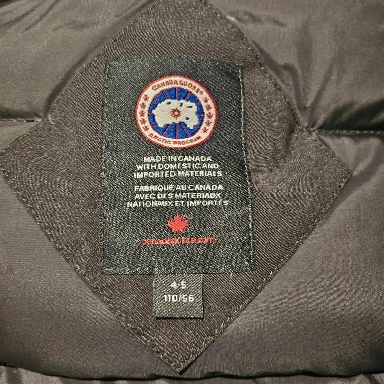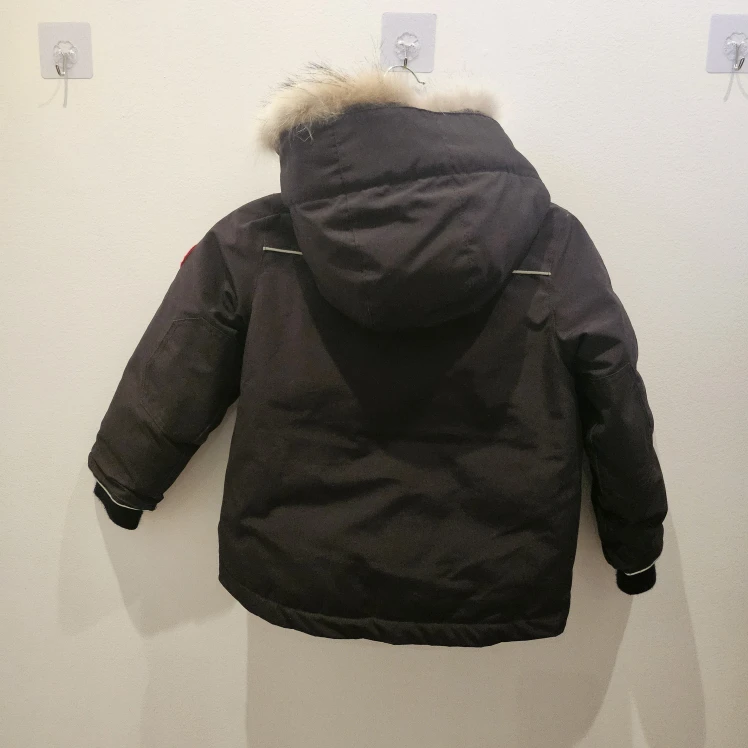 Selling a Canada Goose kids' down parka in size 4-5 (110/56). It's a warm and durable jacket, perfect for Canadian winters! The jacket features a fur-trimmed hood and the classic Canada Goose logo patch.