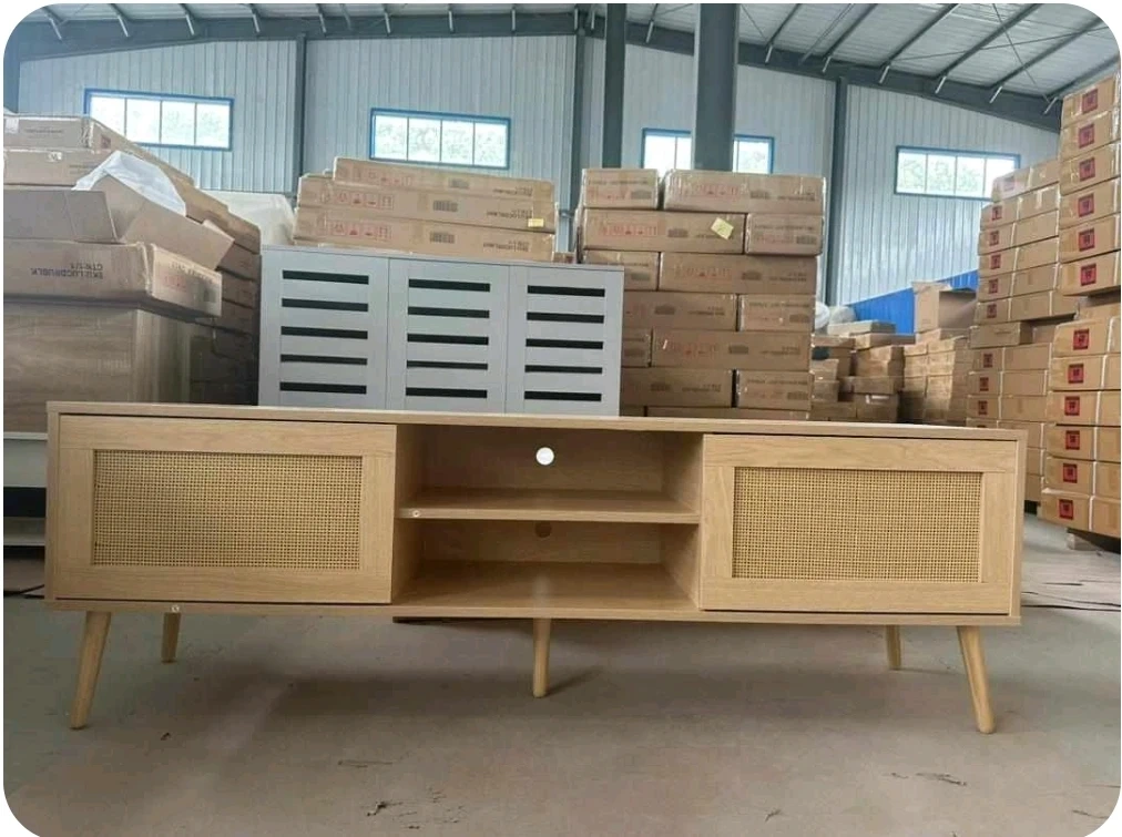 Here's a lovely wooden TV stand featuring stylish rattan doors. It's perfect for adding a touch of natural texture to your living room. The stand has open shelving for your media devices and closed storage behind the doors to keep things tidy.