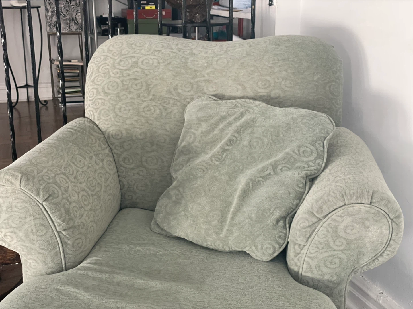 Comfy chaise lounge chair perfect for relaxing! It features a unique green patterned design and comes with a matching pillow. It's a great addition to any living room or bedroom. Used, best offer takes it. Located uptown on Broadway, Fort George area.