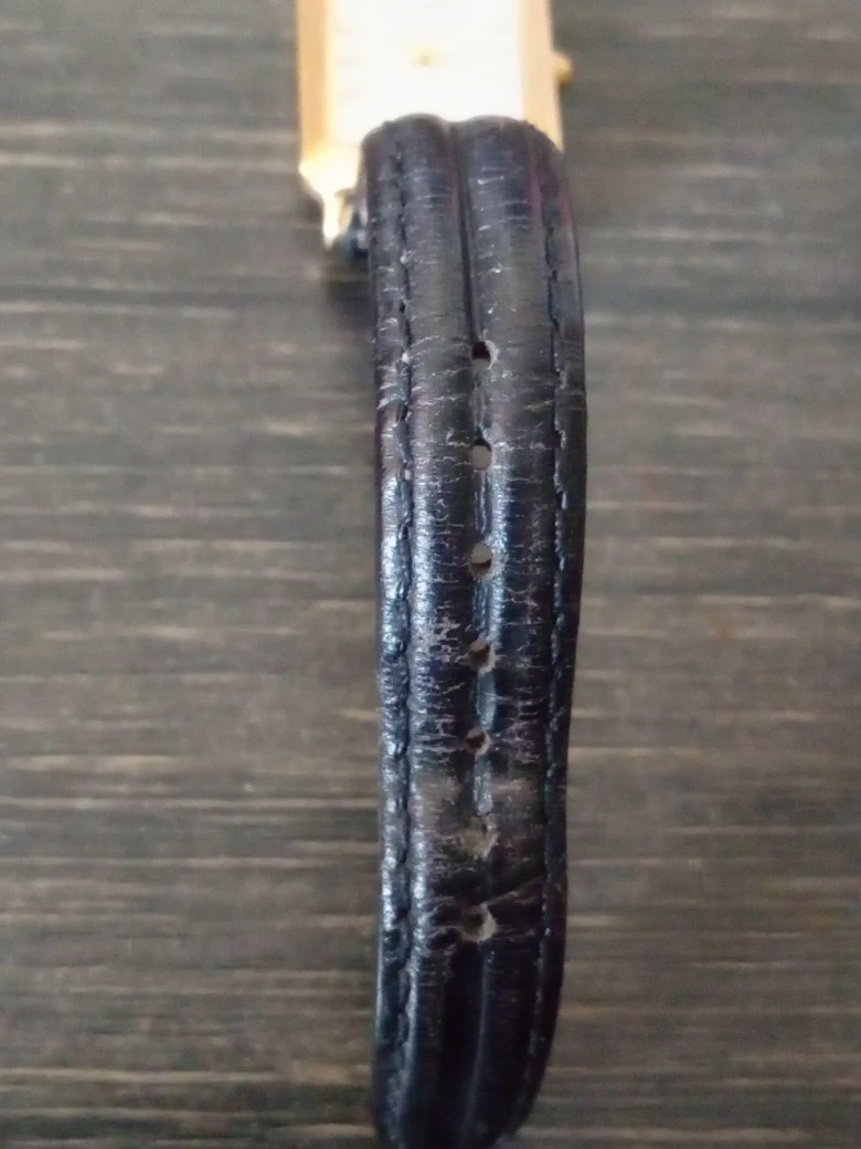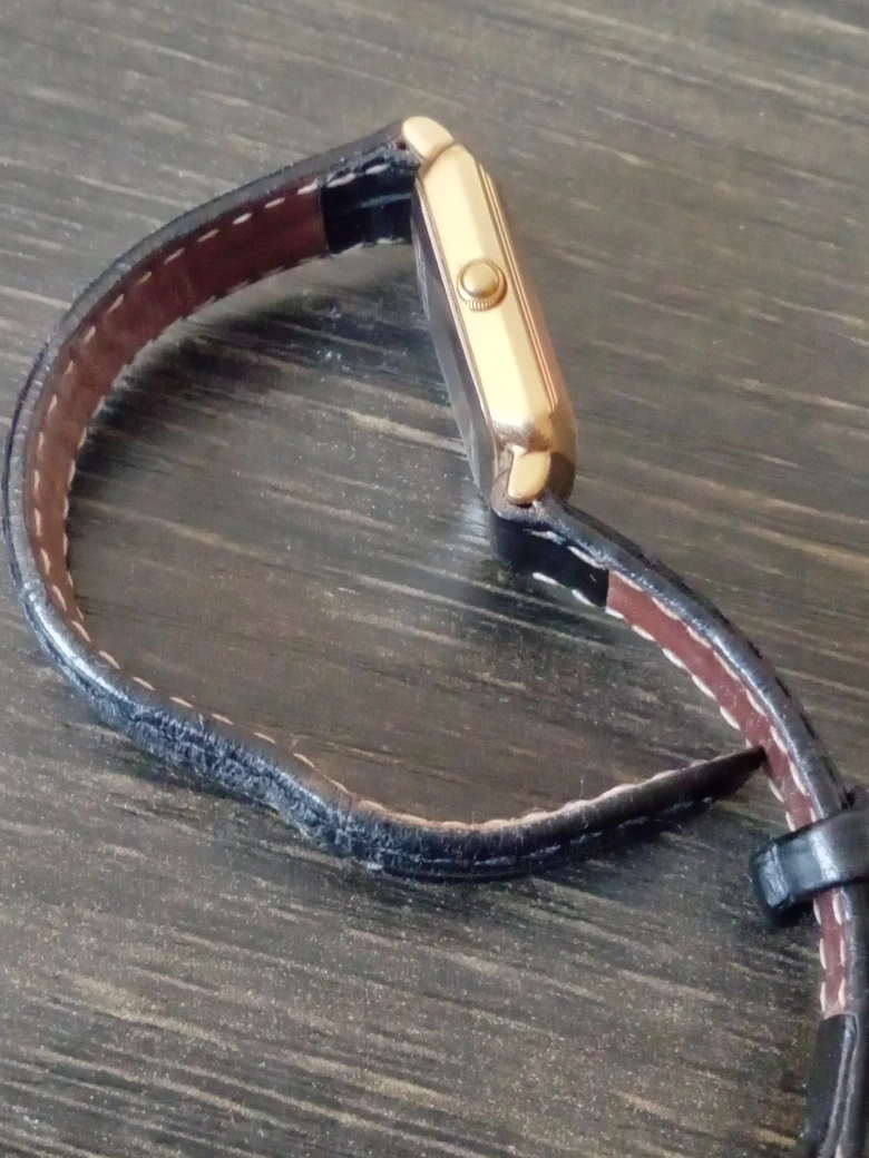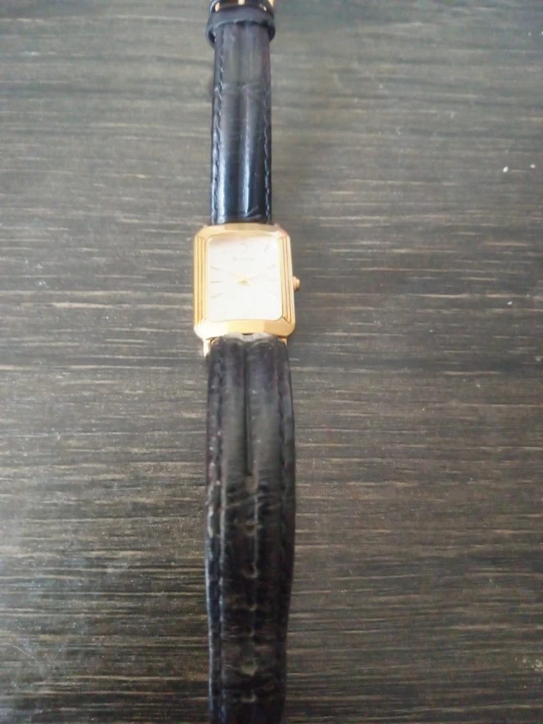 Selling a Bulova Quartz women's watch! It has a gold-tone rectangular case and a black leather strap. It's in good condition and ready for a new wrist!