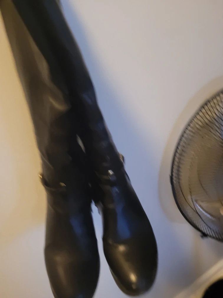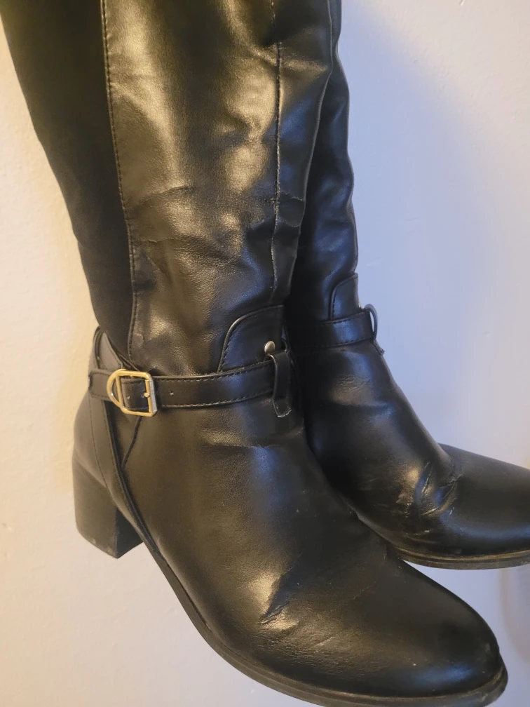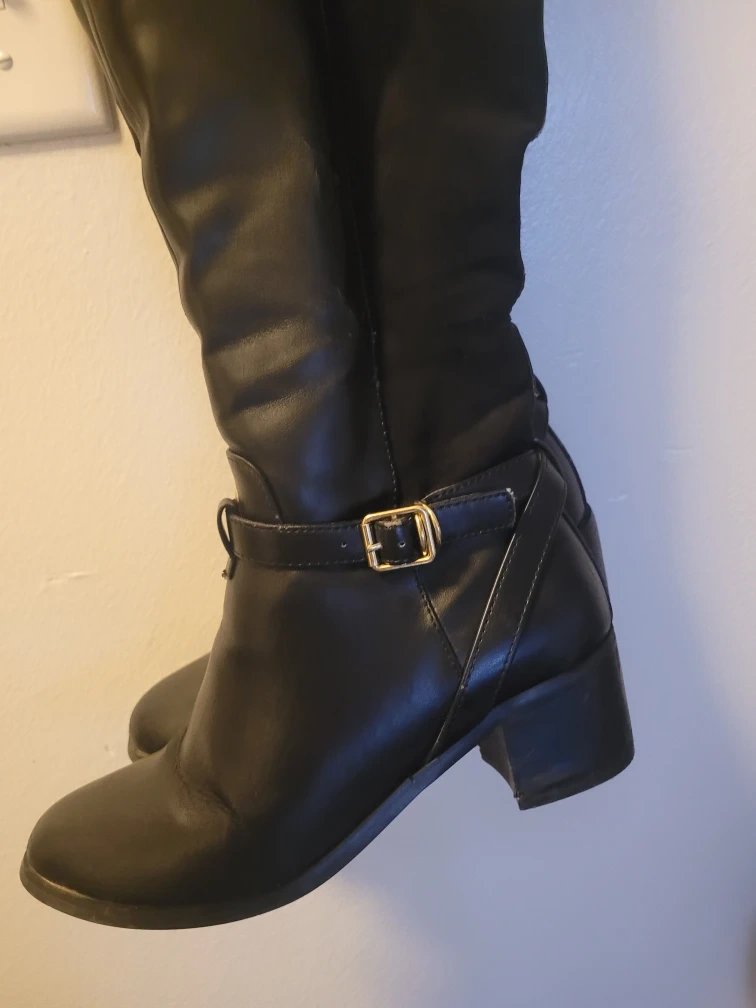 Selling a pair of black knee-high boots. They show some signs of wear, as you can see in the photos. They feature a buckle detail and a block heel. Perfect for fall and winter!