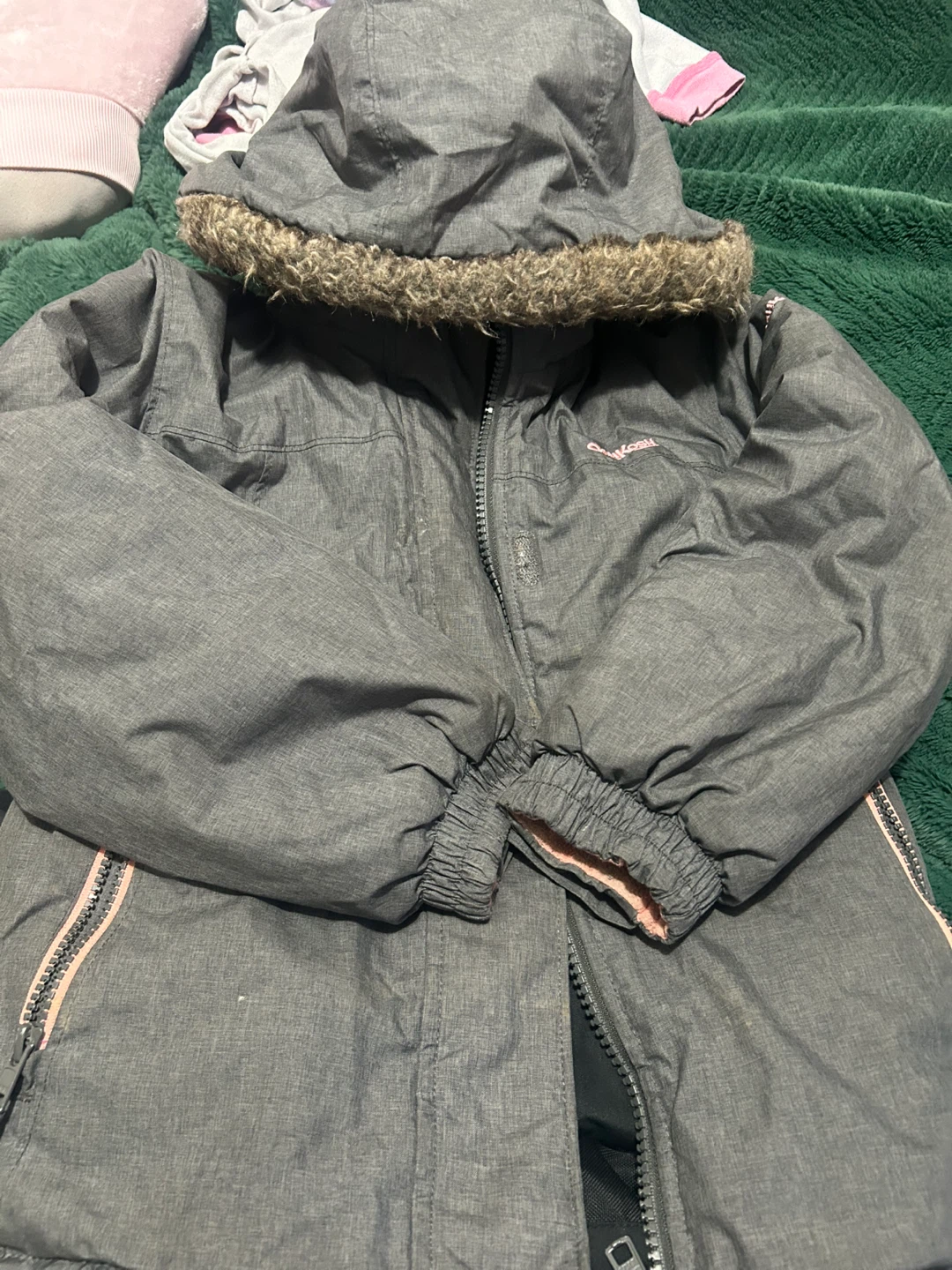 It includes a grey jacket with a fur-trimmed hood and black snow pants with OshKosh B'gosh branded suspenders.