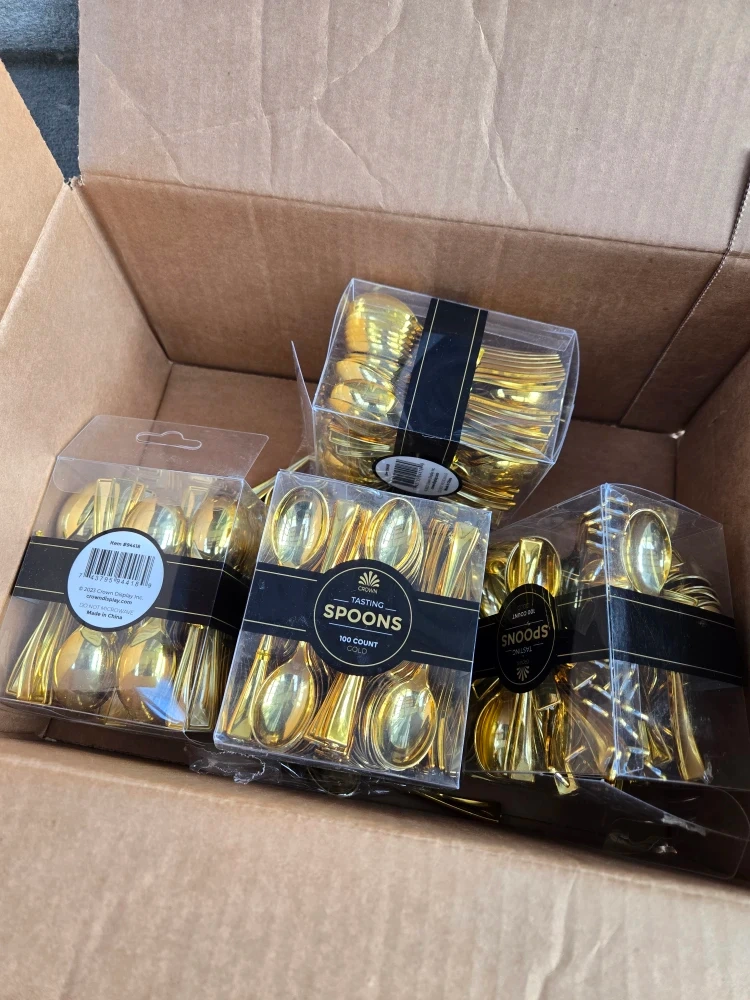 Selling four boxes of Crown Display Tasting Spoons in gold! Each box contains 100 spoons, so you'll get a total of 400. Perfect for parties, events, or just stocking up your kitchen. They come in their original packaging