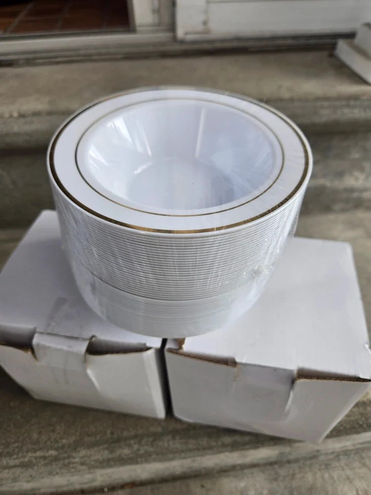 Selling a stack of white plastic bowls with a gold rim. They're still sealed in their original packaging and ready for your next gathering or event