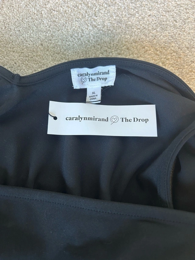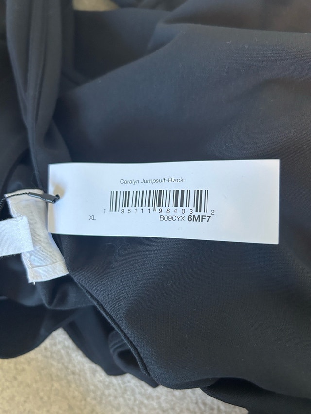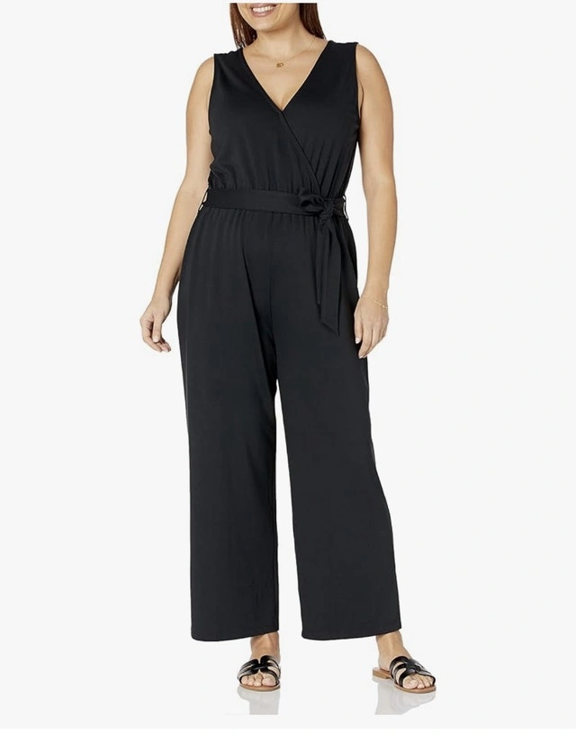 Fabric type 68% Viscose, 27% Polyester, 5% Spandex. Care instructions Machine Wash. Closure type Hook and Eye. Inseam 27 Inches. Staples by The Drop. Caralyn is 5'8.5"/174 cm and wearing a size XL. This jumpsuit inseam is 27"/69 cm long. Fit: Regular- designed to follow the body - neither loose nor clingy. Interlock Stretch Knit. Removable belt. Chic black sleeveless jumpsuit with a flattering V-neckline. Perfect for any occasion.