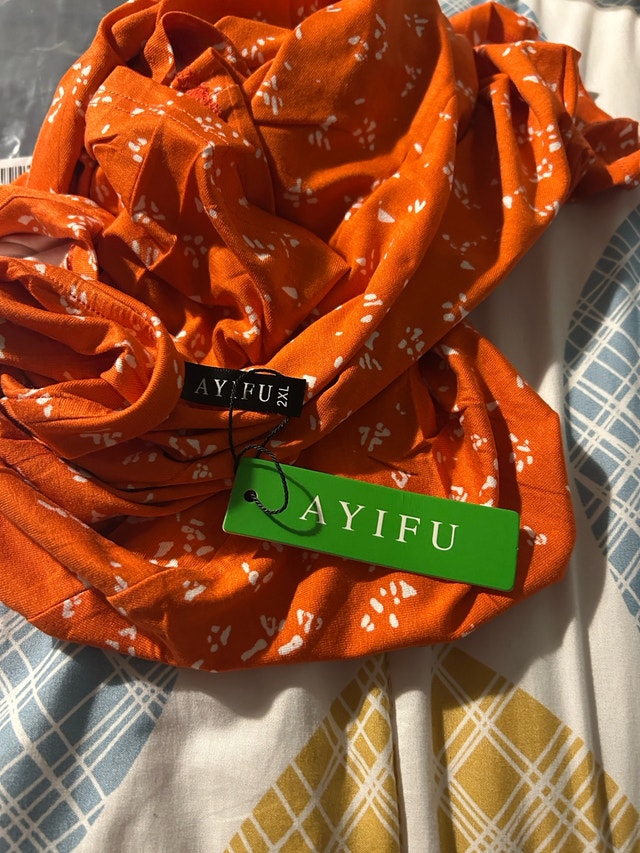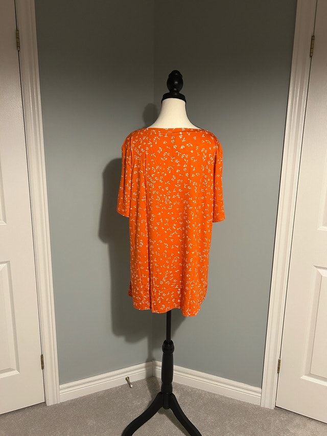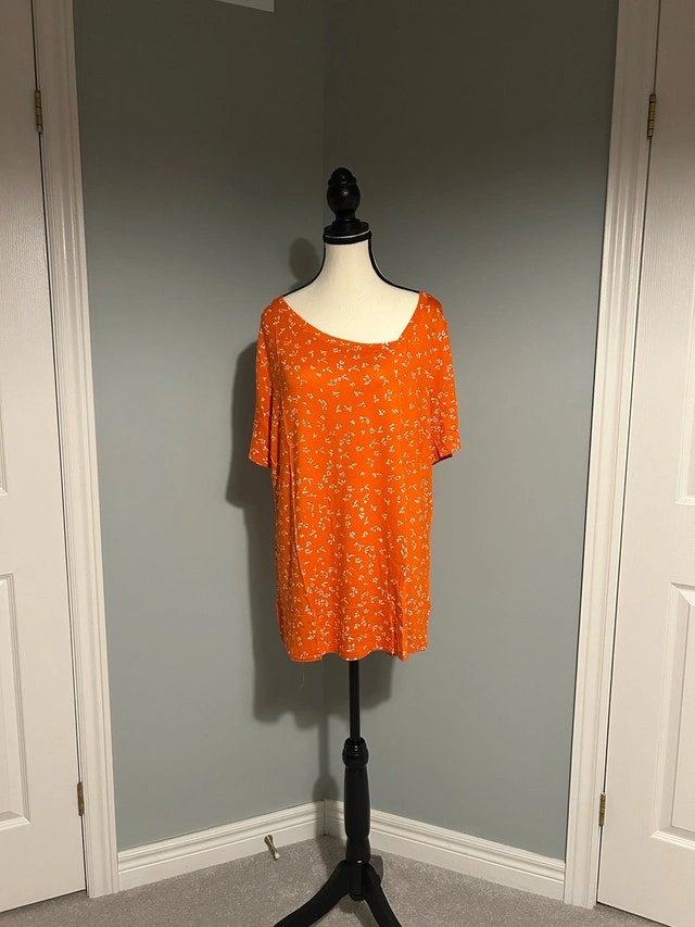 Spruce up your wardrobe with this brand new AYIFU women's 2023 summer top, a charming tunic with short sleeves and an asymmetric neckline, adorned with a delightful scattered floral print in red on a vibrant orange background, perfect for a casual yet stylish look. This blouse is made with 95% rayon and 5% spandex. Specifications: * Size: XXL * Colour: Orange/Red * Material: 95% Rayon, 5% Spandex