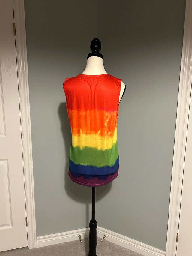 Show your support with this vibrant 'Love Wins' rainbow tank top, size small, made from a comfortable 95% polyester and 5% spandex blend. This colourful tank is perfect for pride events or everyday wear. It is new in the original packaging. * Size: Small * Material: 95% Polyester, 5% Spandex * Design: Rainbow with 'Love Wins' print