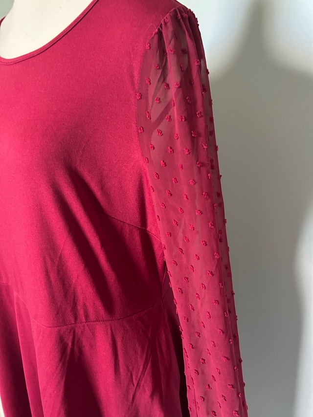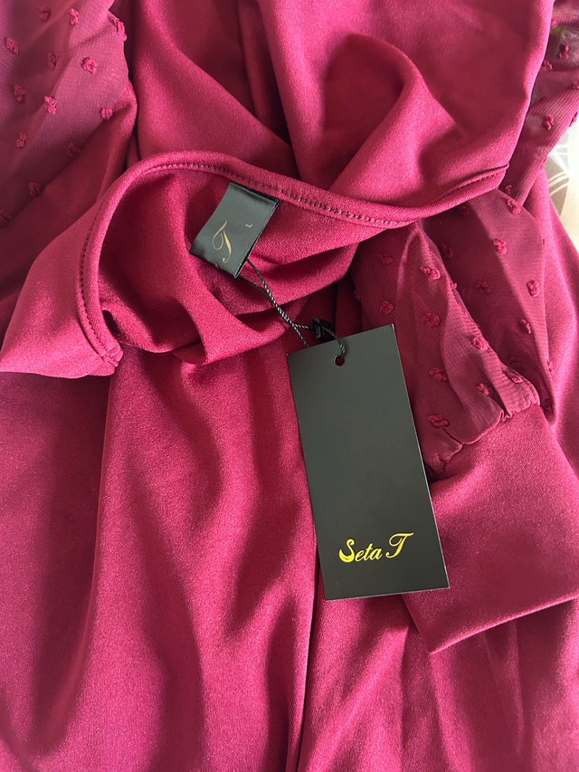 I'm selling a Seta T wine red dress, perfect for a sophisticated look. It features long sleeves with a unique dotted design. Although it's new with tags, it's time for it to find a new home in your wardrobe! Features: - Colour: Wine Red - Sleeve Style: Long sleeves with dotted design - Brand: Seta T - Condition: New with tags