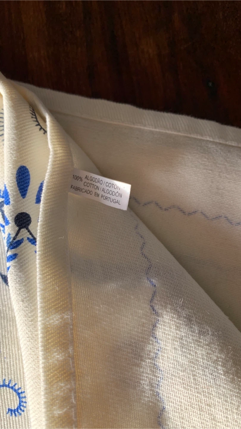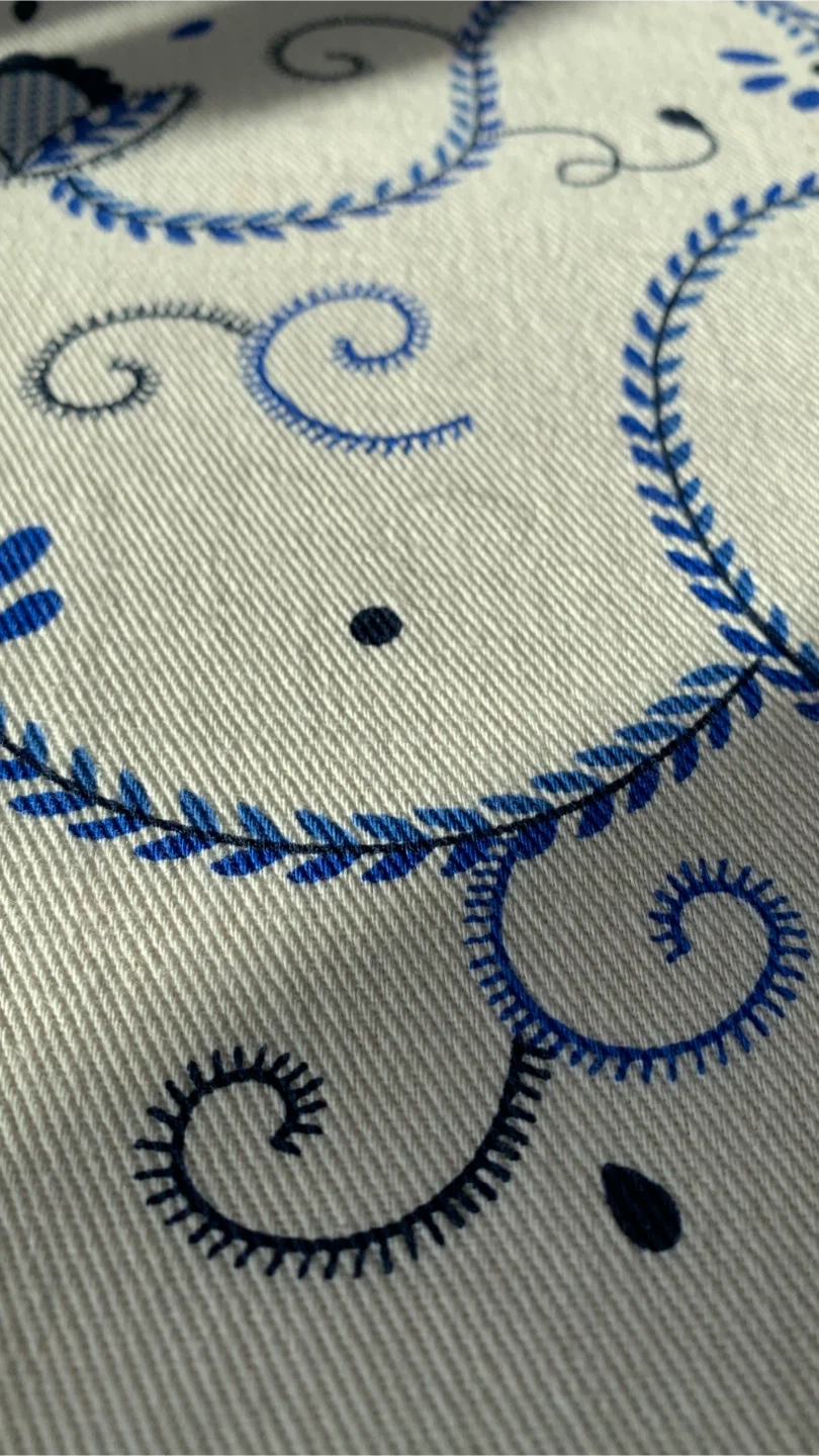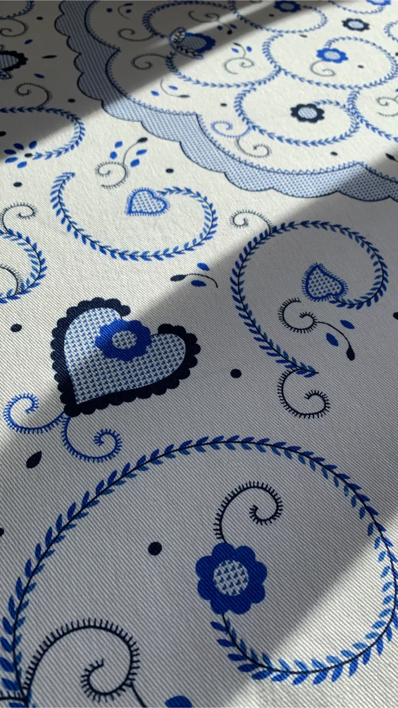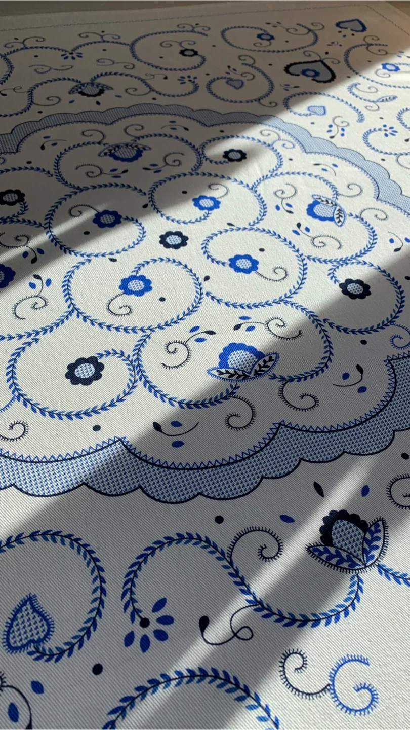 Traditional Portuguese "Viana embroidery" inspired design in blue and white. The design features a vibrant, printed pattern with traditional floral motifs, swirls, and heart shapes. It is inspired by the cultural heritage of Viana do Castelo, a city in Northern Portugal known for its distinctive embroidery style. This style is popular for kitchen and dining textiles, such as tablecloths and tea towels.