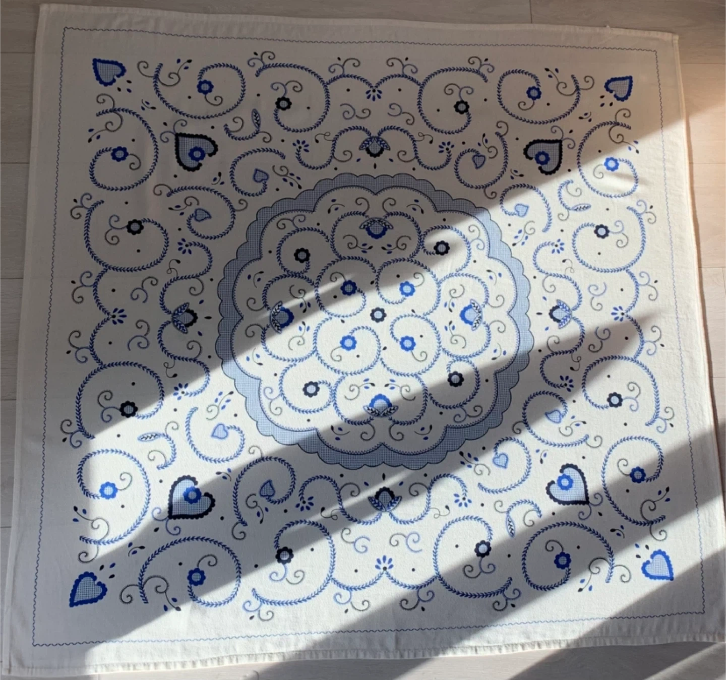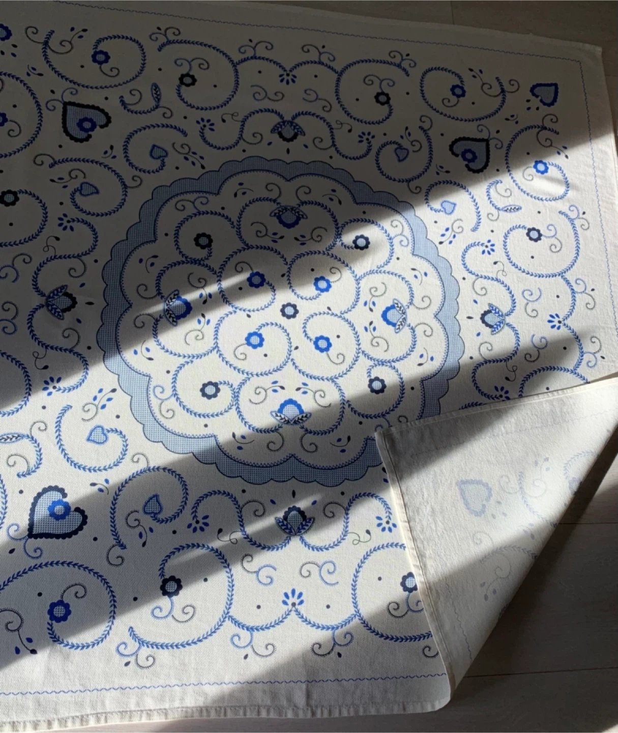 Selling a lovely cotton tablecloth! It features a charming white base with a beautiful blue floral design. It is made of 100% thick high quality cotton. Perfect for adding a touch of elegance to your dining space.