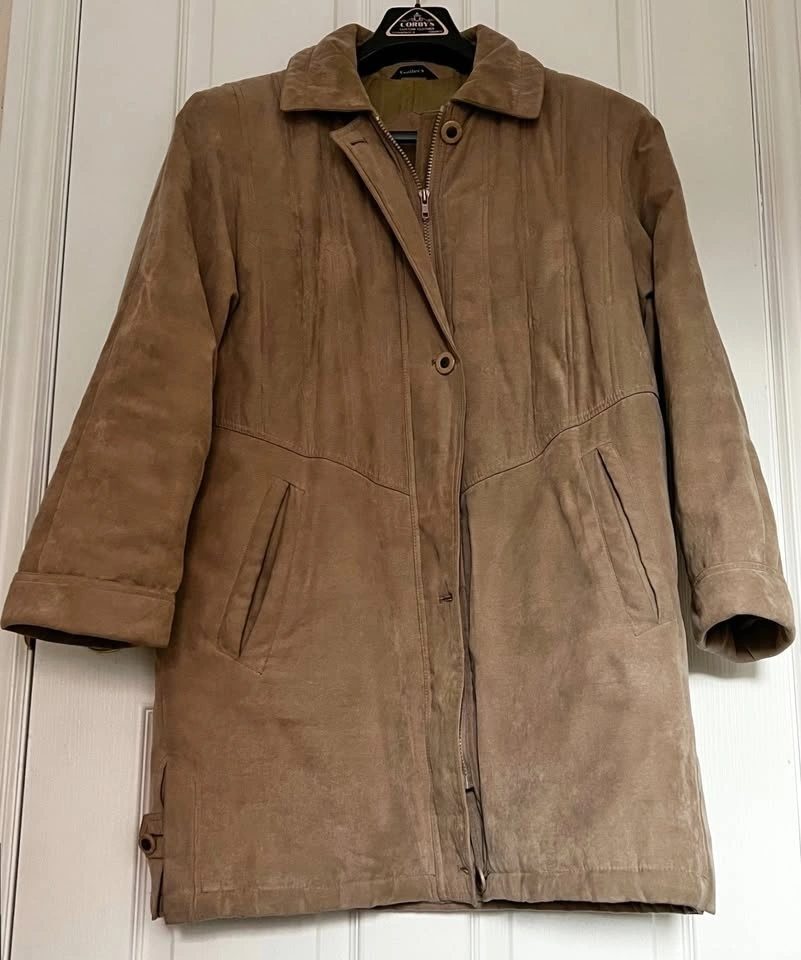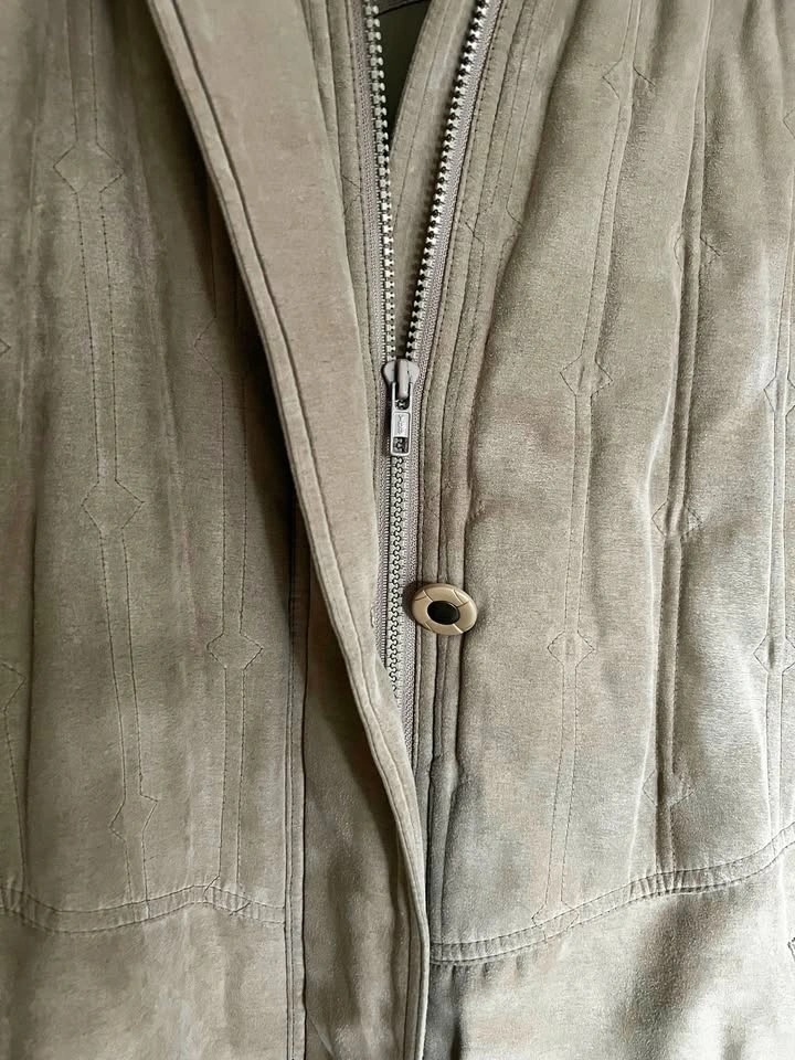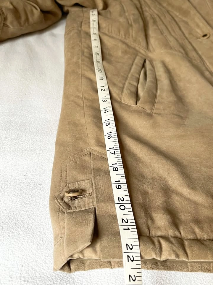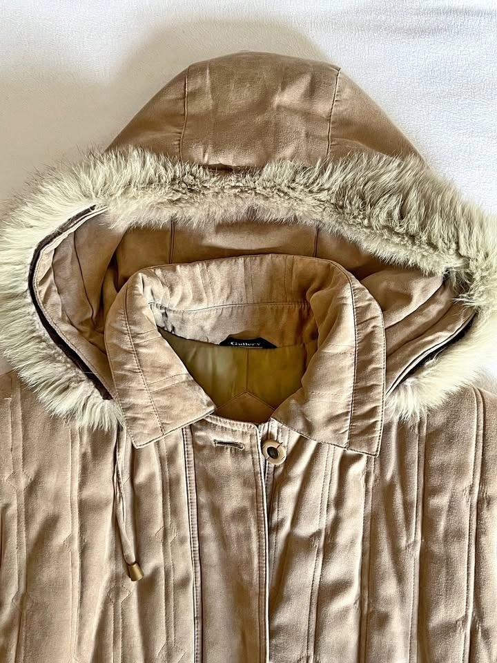Winter is coming! This jacket is super warm and cozy. Both zipper and buttons give option for added warmth when needed. Three-quarter length is just long enough to keep warm. Detachable hood. Fits medium size.