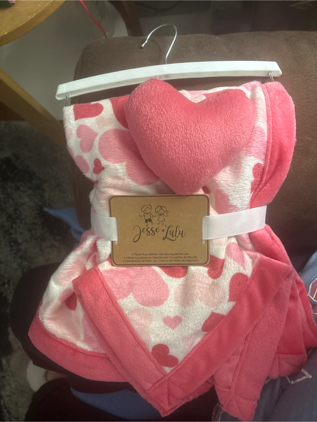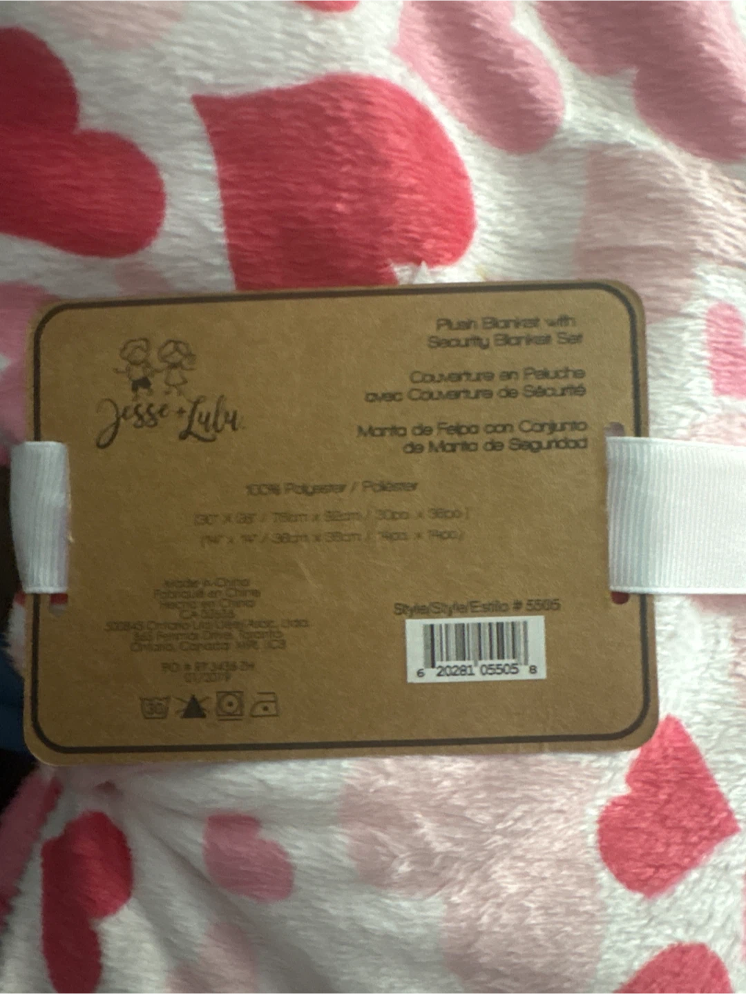This is a brand new Jesse + Lulu 2-Piece Plush Blanket with Security Blanket Set! It's so soft and cuddly, perfect for a little one. The blanket is made of 100% polyester and measures 30" x 30" / 76cm x 76cm.