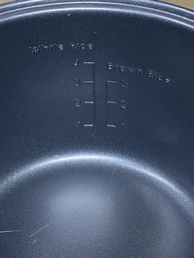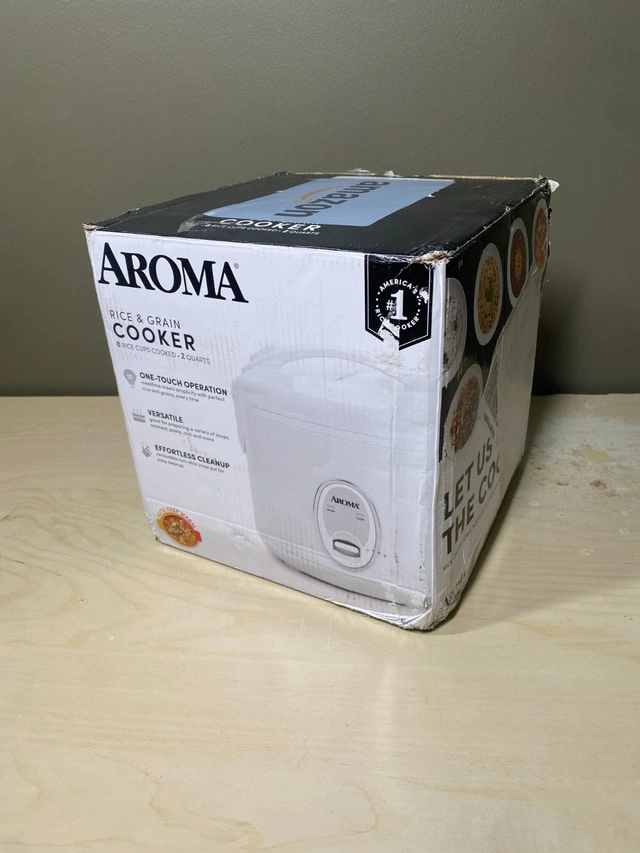 Airdrie, Morningside pickup. Product is as described or money back. New and unused. "Aroma" 4-cup rice cooker with versatility. ***Small scratch at the bottom of the inner pot. Pictured. Regular Amazon price: $50 W2-1566-25