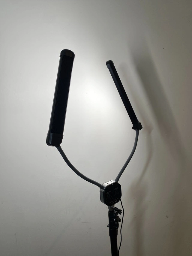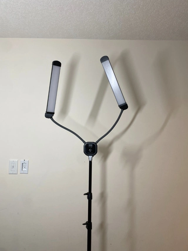 Airdrie, Morningside pickup. Product is as described or money back. Regular Amazon Price: $ 155. New, unused, open box. Box has a lot of tape on it, but is in good condition. Dual lamp with 360 degree rotation. USB interface. Port for batteries, sold separately. Brand: GSKAIWEN. Tripod from 50-200cm, light length 35cm W7-3297-45. Feel free to message if you have any questions!