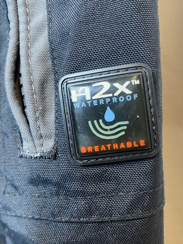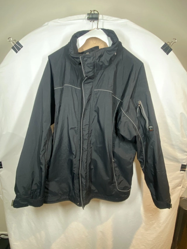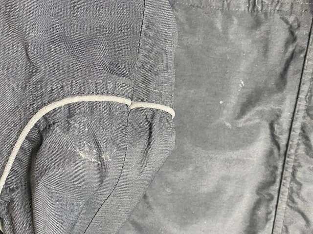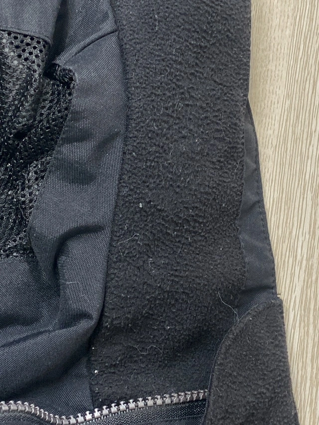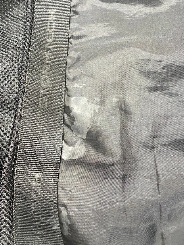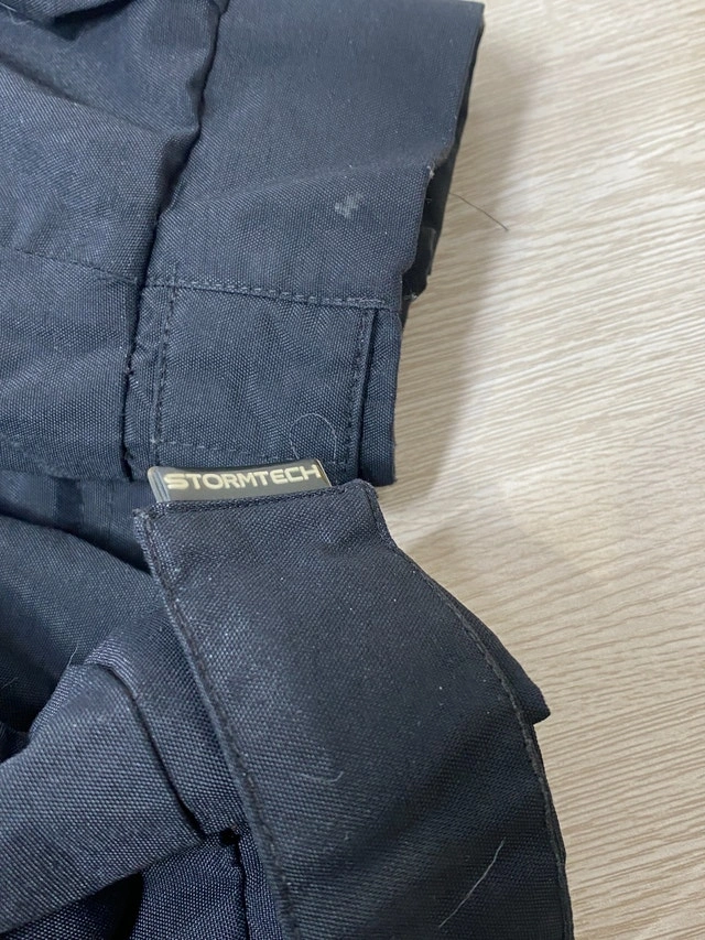 Airdrie, Morningside pickup. Product is as described or money back. Stormtech H2X Waterproof Breathable jacket. * Black with grey trim. * No hood. * Dual front zipper, top buttons and Velcro flaps. * Inner mesh liner with a zipper. * Zippered front pockets. * Zippered arm pocket. * Zippered inside pocket. * Zippered underarm vents. * Outershell Nylon * Lining - Polyester Great condition. * Some piling on the collar and mesh liner. Pictured. * Some small discoloration/stain on the lower left cuff and lower left front side. Pictured. * A little threading, but not tearing. * Velcro is good but has a little "fluff" deep inside. * No rips or tears. * All zippers working 100%. R2-T0009-17