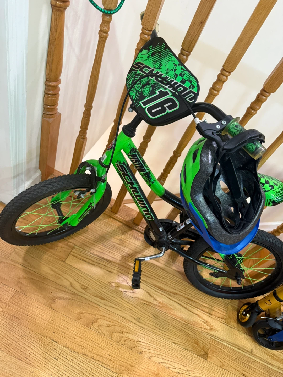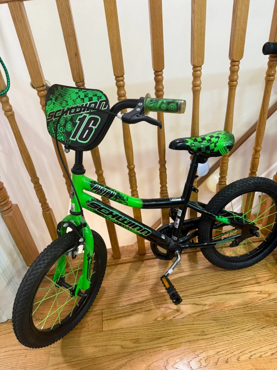 Selling a Schwinn 16" boys bike in green and black! It's in good condition and ready for a new rider. Perfect for kids learning to ride or just cruising around the neighborhood. Comes with a helmet!