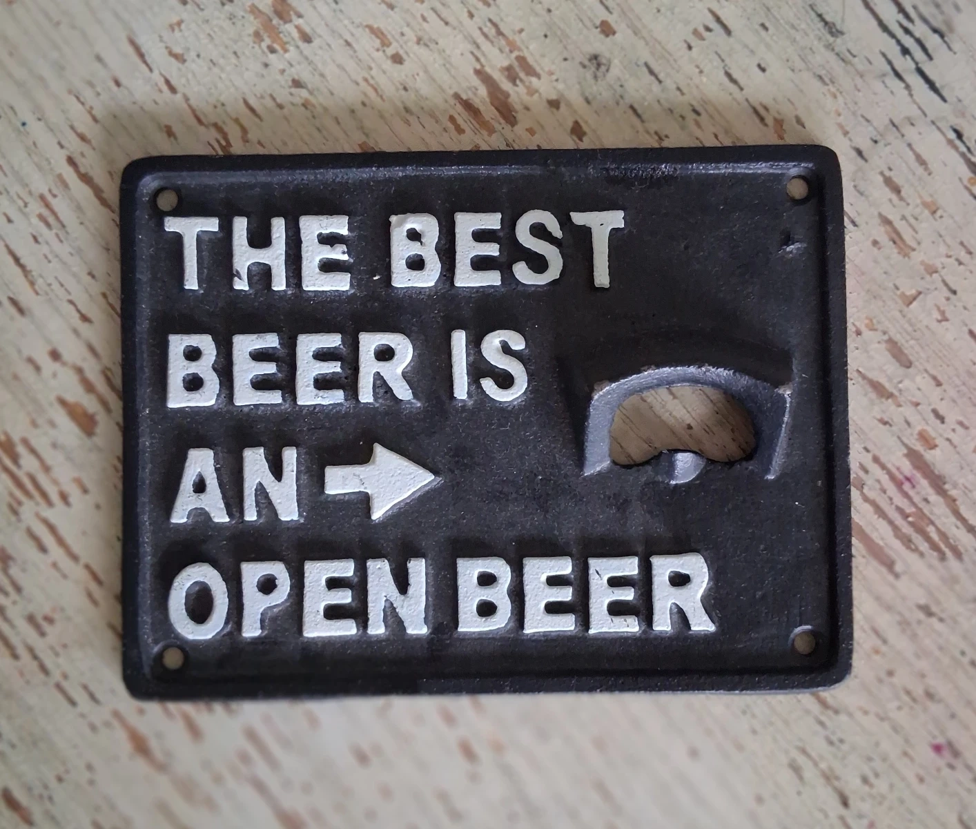 Metal bottle opener that says, 'The Best Beer is an Open Beer'. It can be mounted on a wall at the Cottage, in the kitchen, the Dude room! Perfect for anyone who l♥️ves a Brown Pop!