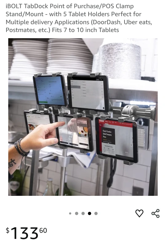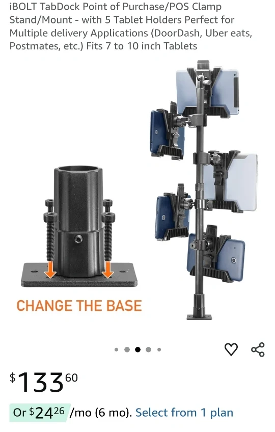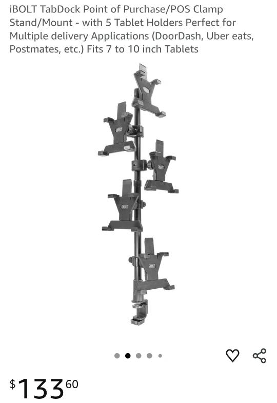 Selling an iBOLT TabDock Point of Purchase/POS Clamp Stand/Mount with 5 tablet holders. Perfect for multiple delivery applications like DoorDash, Uber Eats, and Postmates. It fits 7 to 10 inch tablets. The max height is 8 inches and the min height is 4 inches, with a max width of 0.75 inches.