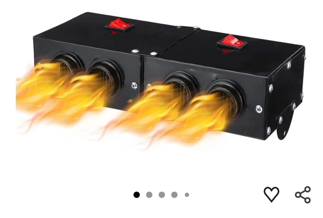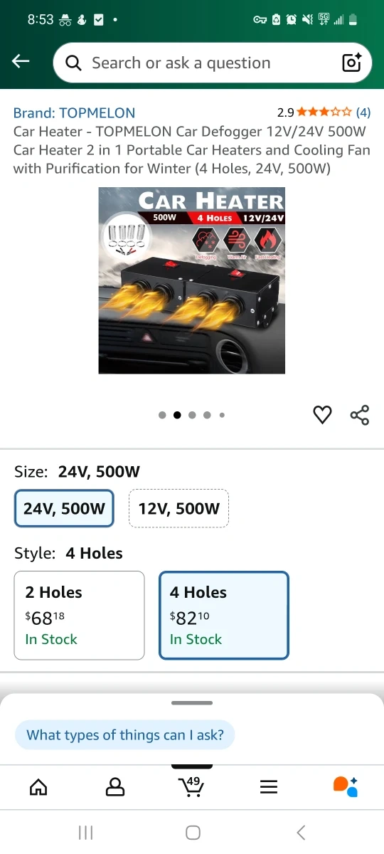 Selling a TOPMELON car defogger and heater, perfect for winter! It's a 2-in-1 portable car heater and cooling fan with purification. This model has 4 holes and supports both 12V and 24V power, at 500W.