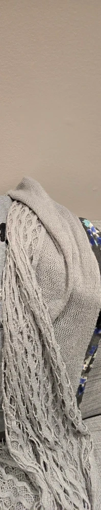 a cozy grey knit scarf with a fringe detail. It's in great condition and perfect for adding a bit of warmth and style to any outfit!