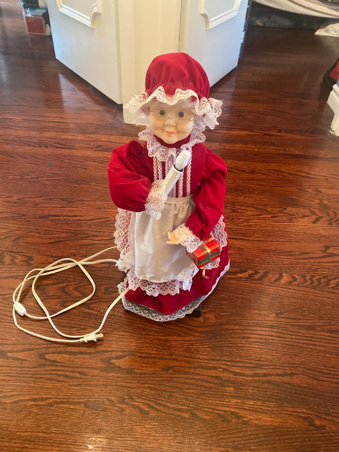 Mrs clause, plug her in and her she moves her lantern. She about 22” high. She’s a bit ripped on the apron . She still
