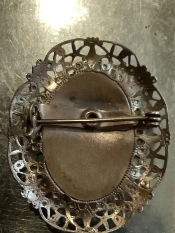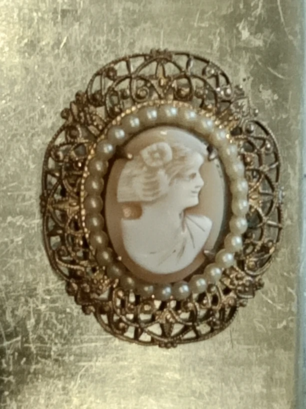 Selling an Antique Hand-Carved Shell Cameo Brooch. It features a delicate portrait surrounded by intricate gold-tone filigree and faux pearls. A lovely piece for adding a touch of vintage charm to any outfit!