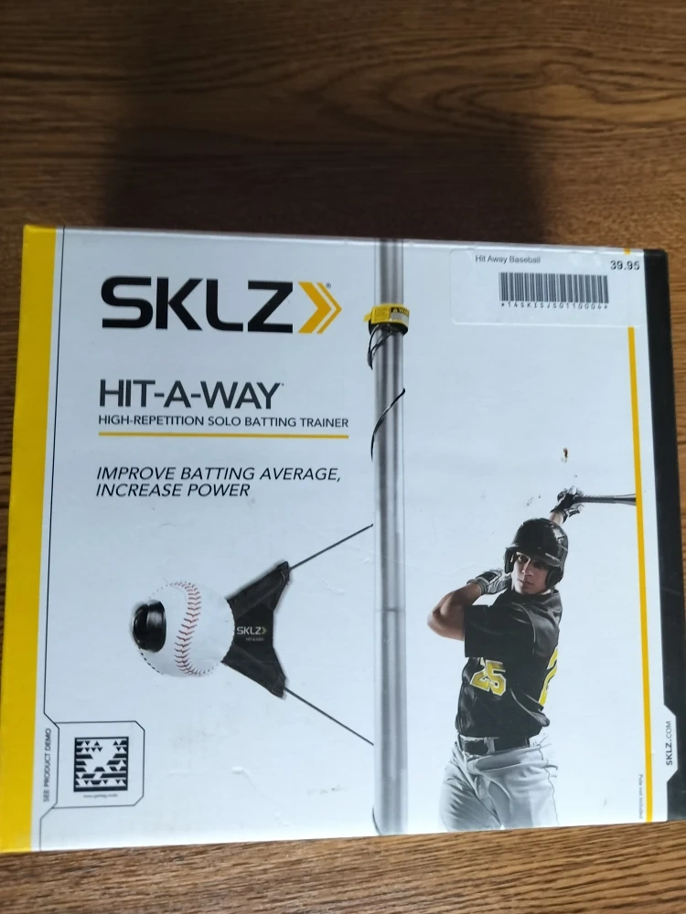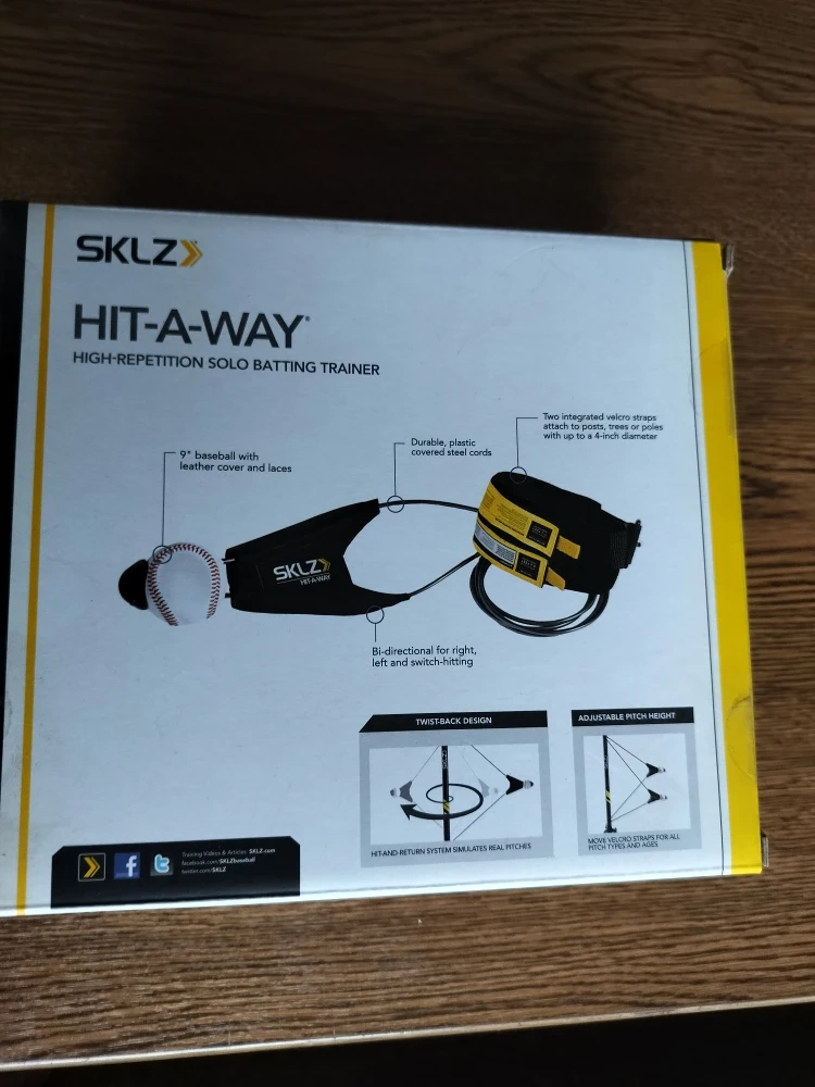 Get ready to improve your batting average with the SKLZ Hit-A-Way high-repetition solo batting trainer! This trainer is designed to increase power and is bi-directional for both right and left-switch hitting. It features a 9" baseball with a leather cover and laces, durable plastic-covered steel cords, and two integrated velcro straps compatible with up to a 4-inch diameter. The hit-and-return system simulates real pitches, and the adjustable pitch height allows for use with all bat types and sizes. Originally bought for $39.95