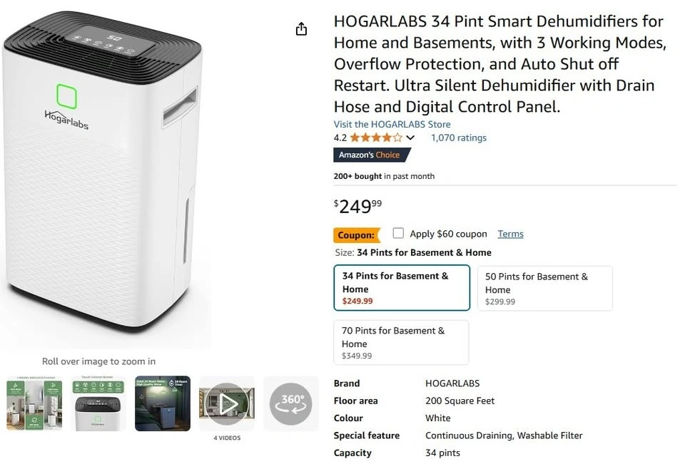 High Moisture Removal: Capable of removing up to 34 pints of moisture daily, ideal for basements, garages, bathrooms, bedrooms, kitchens, RVs, homes, offices, or any medium-sized rooms. Helps protect furniture and prolong the lifespan of appliances by maintaining optimal humidity levels.