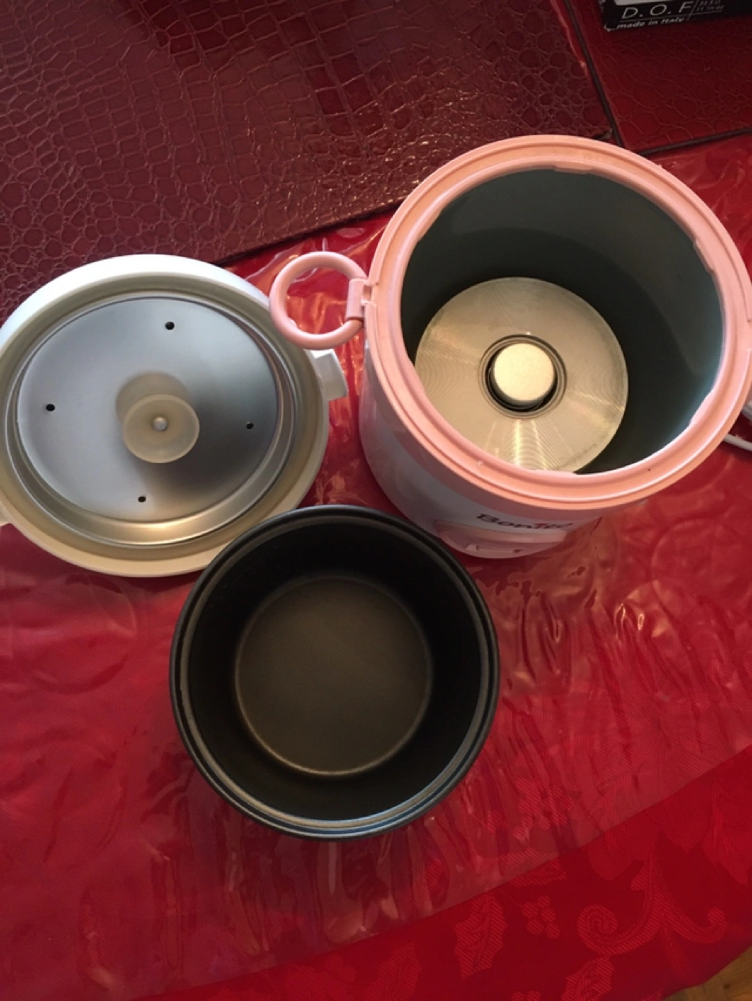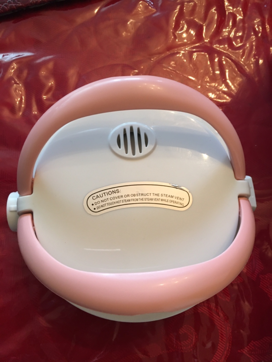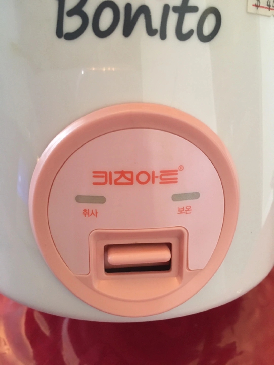 Selling a Bonito 1.5 cups rice cooker in white and pink. It's in used condition and was originally bought for $44.99.