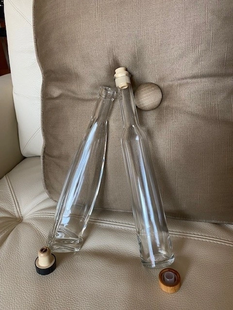 A set of oil and vinegar glass bottles with stoppers. One is round and the other is triangular shaped and made of thick good quality glass. They are 11 to 12 inches in height and have 250 to 275 ml capacity. Can be used for other liquids. Thoroughly sanitized. From a pet and smoke free home. Pickup only in the St. Lawrence market area of downtown Toronto. Cash only.