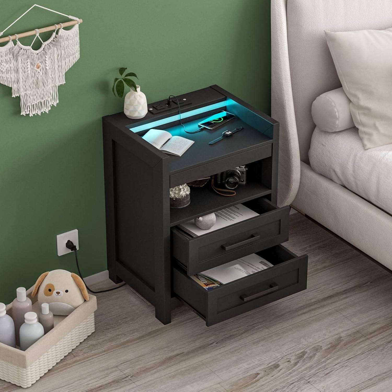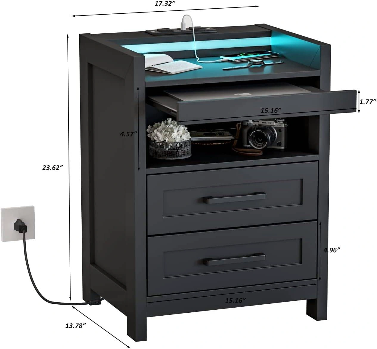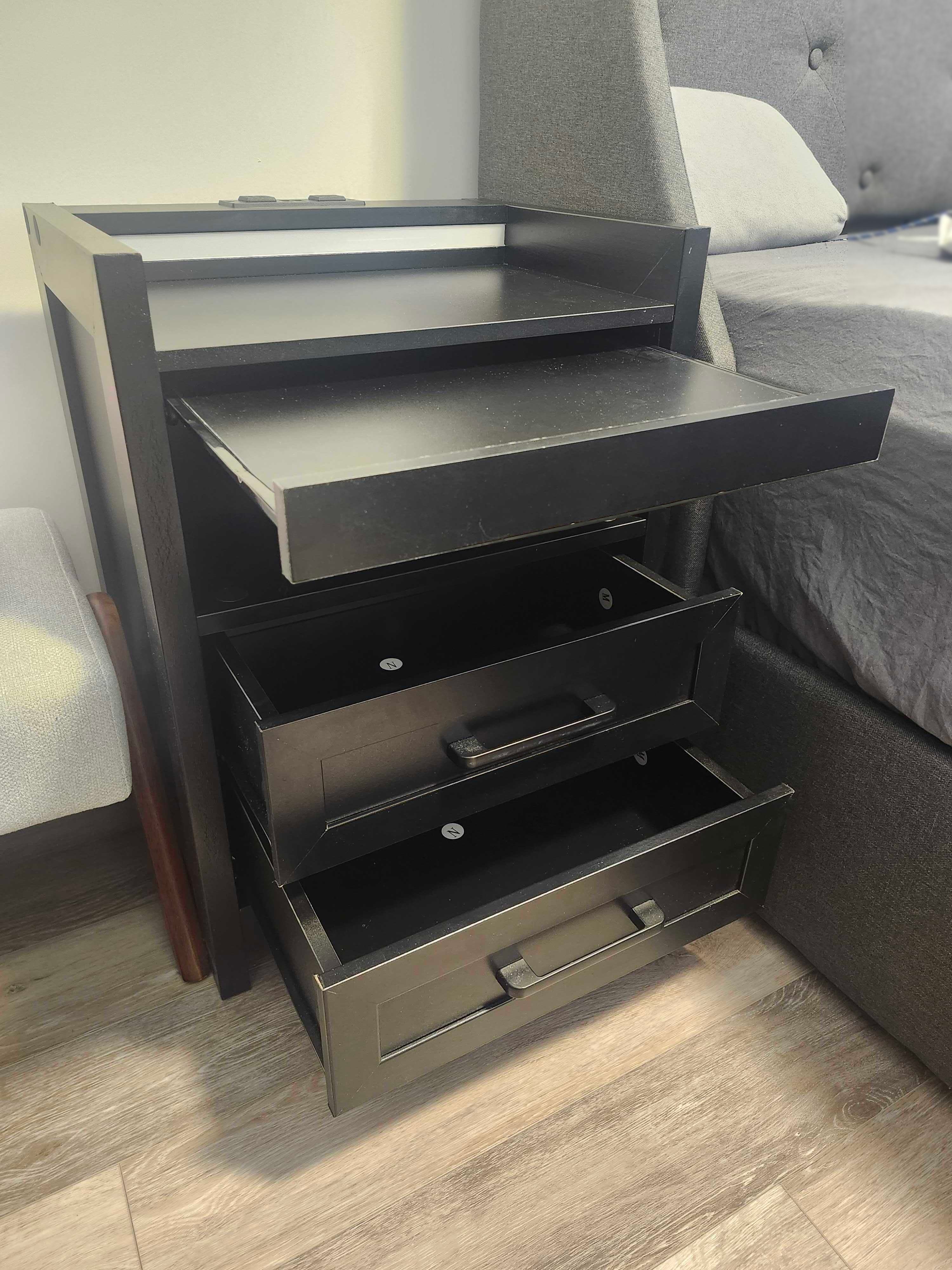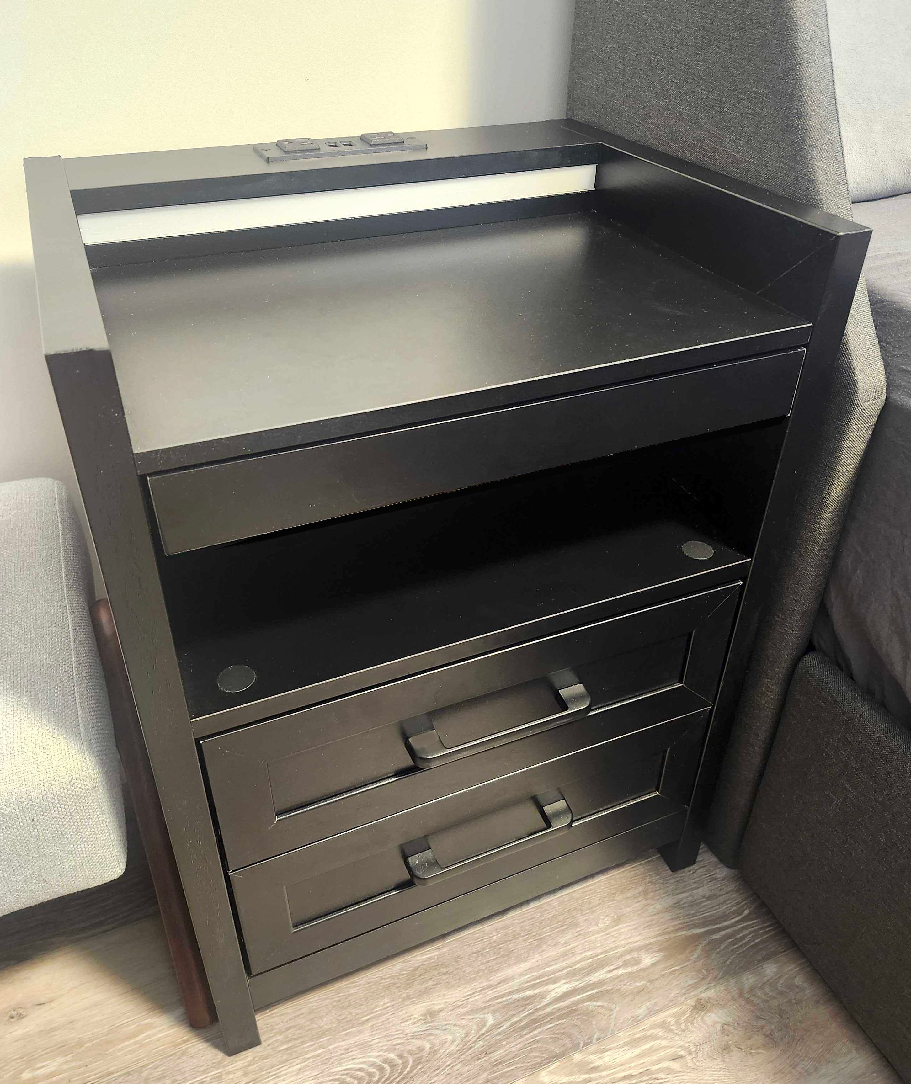 Selling 2 (TWO) modern nightstands with LED light. They feature a built-in charging station on top, perfect for keeping your devices powered up overnight. They also have two drawers for storage and an open shelf. Open to offers: << Both: 100 CAD. Each: 50 CAD. >>