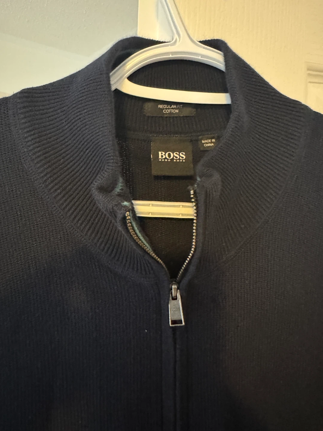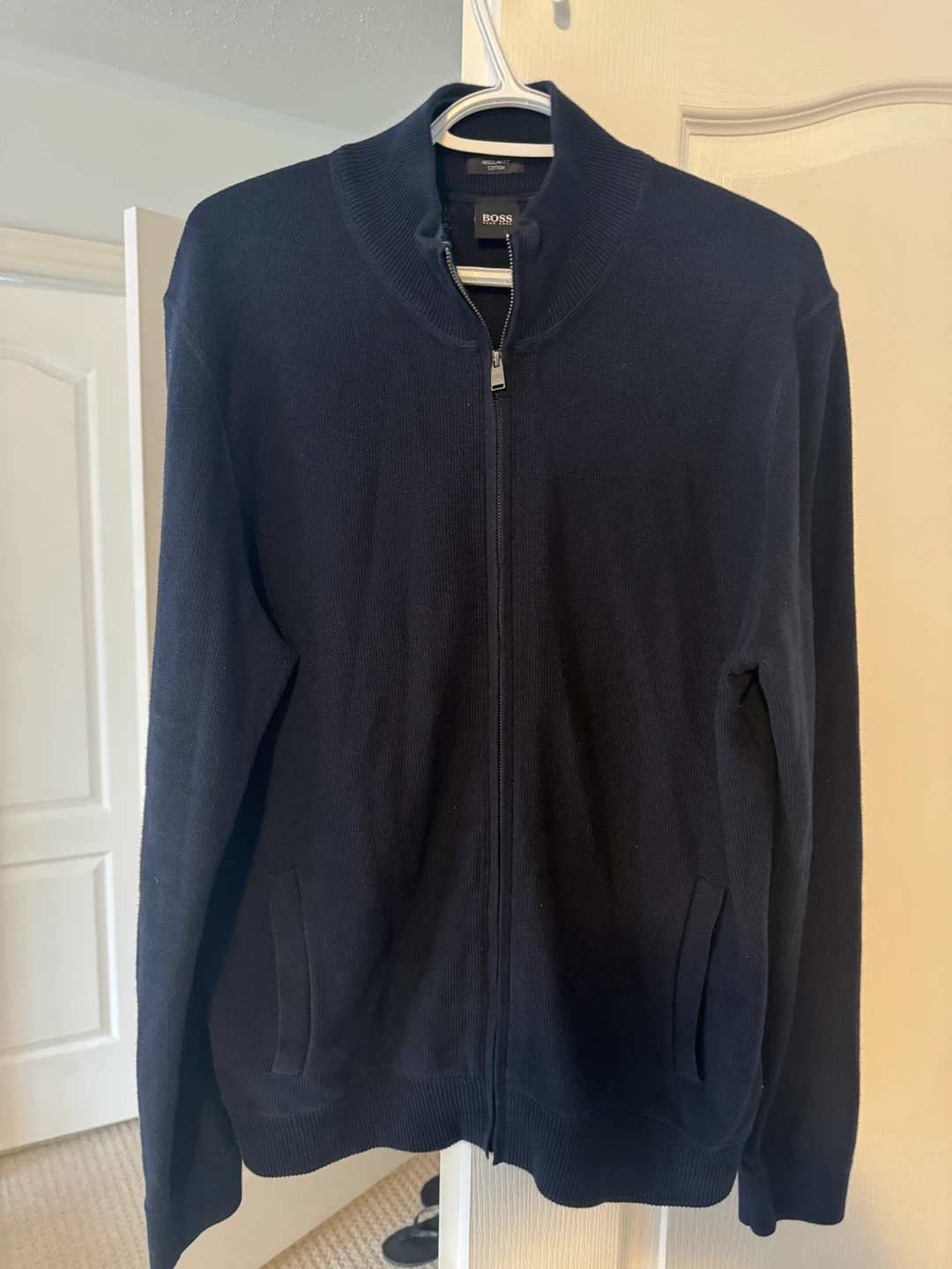 Selling a Hugo Boss cardigan in a regular fit. It's made of cotton and is a size large. Perfect for layering!