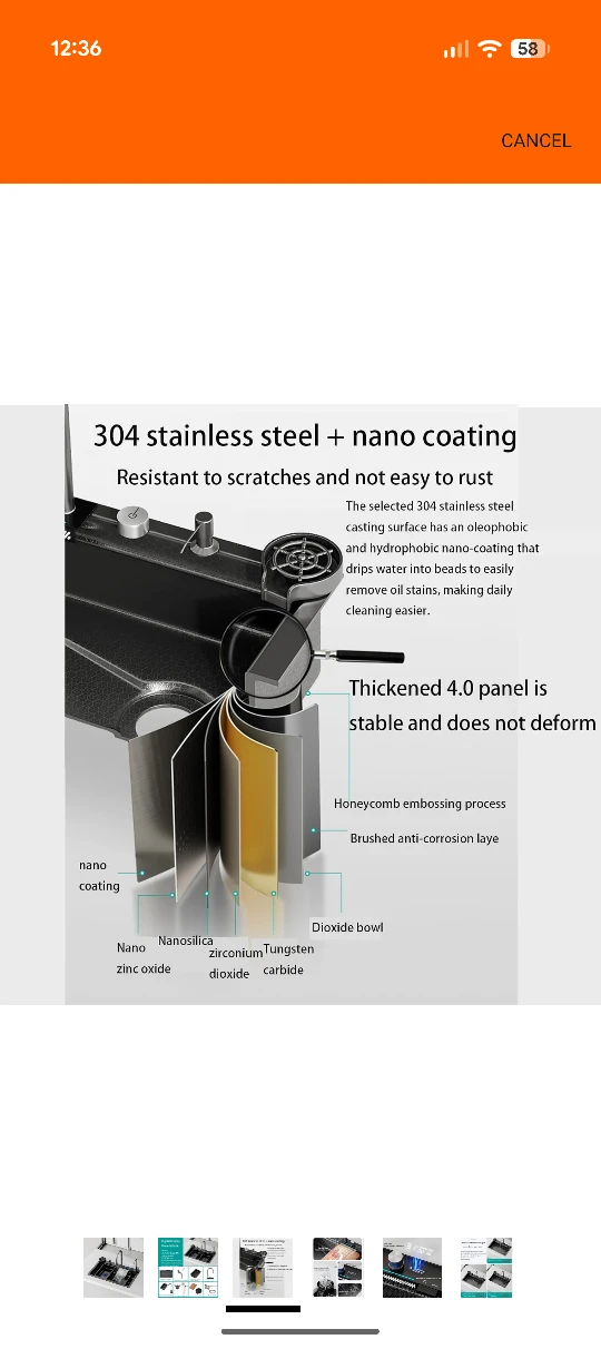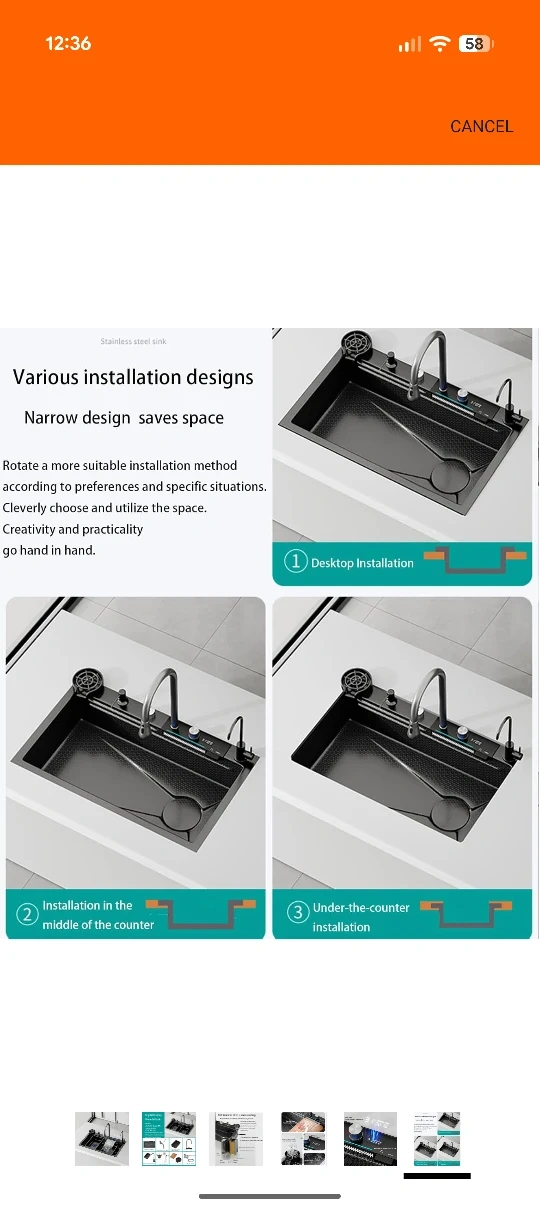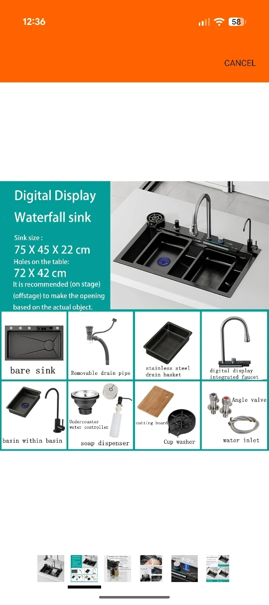 Check out this digital display waterfall sink! It's got a 304 stainless steel construction with nano coating, making it resistant to scratches and rust. The thickened 4.0 panel is stable and doesn't deform. It also features real-time water temperature display and a convenient cup washer. Sink size: 75 x 45 x 22 cm. Holes on the table: 72 x 42 cm.