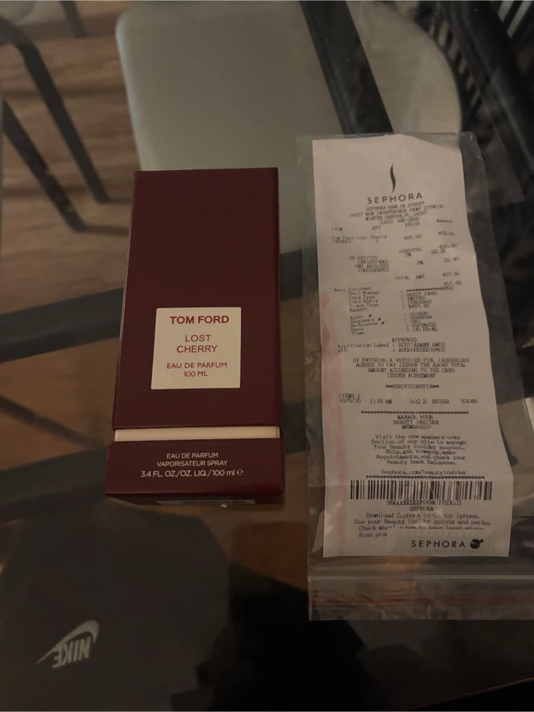 Selling a Tom Ford Lost Cherry Eau de Parfum, 100ml bottle. It comes with the original box. The receipt shows it was originally bought for $405 at Sephora. A luxurious and captivating fragrance!