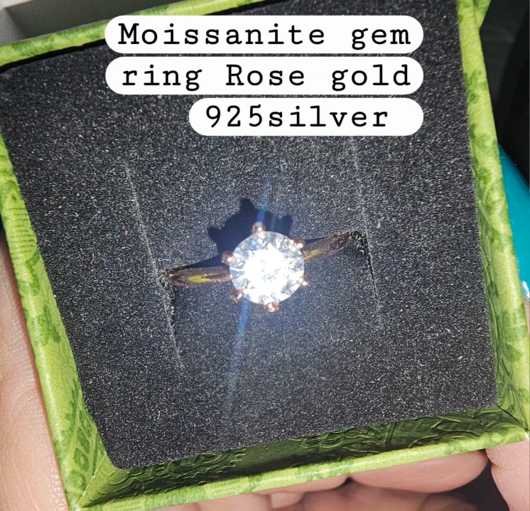 Selling a beautiful moissanite gem ring in rose gold and 925 silver! It comes in a box, ready for its new owner. The ring has a lovely sparkle and is perfect for adding a touch of elegance to any outfit