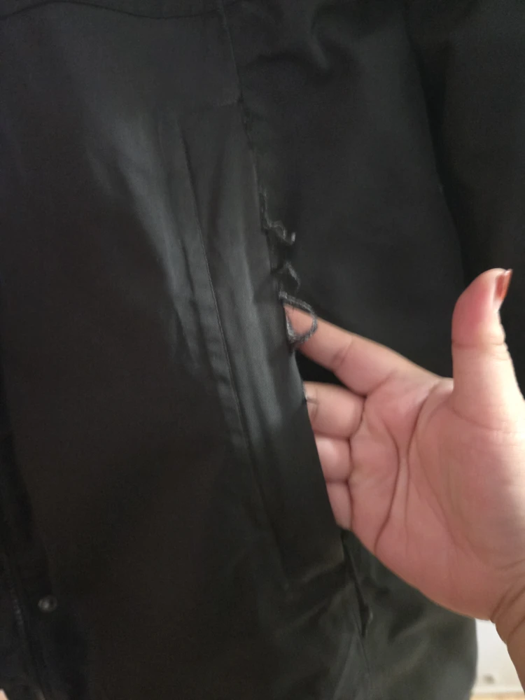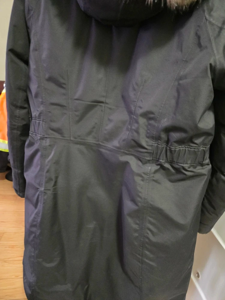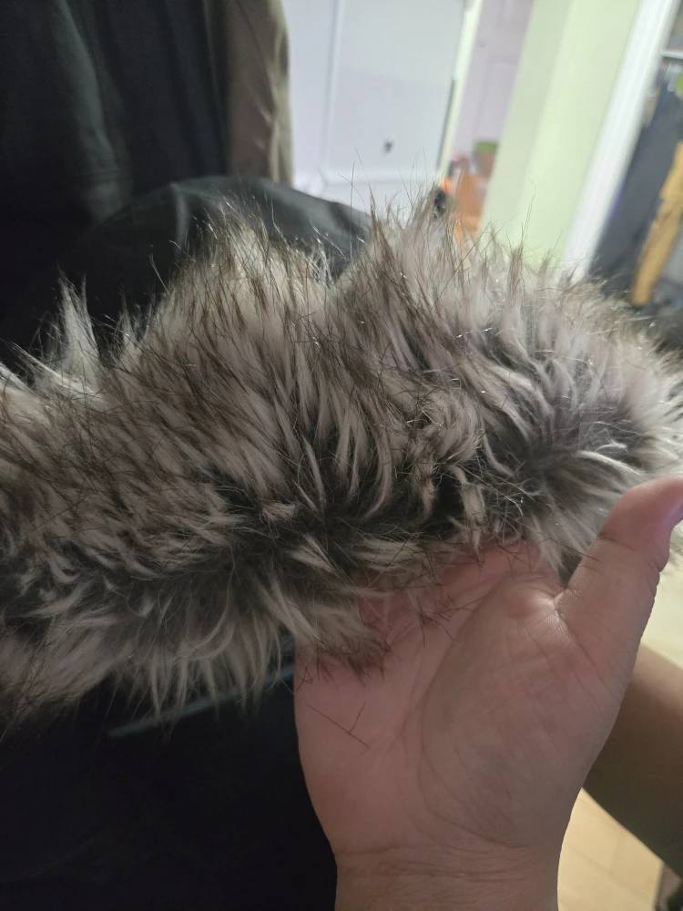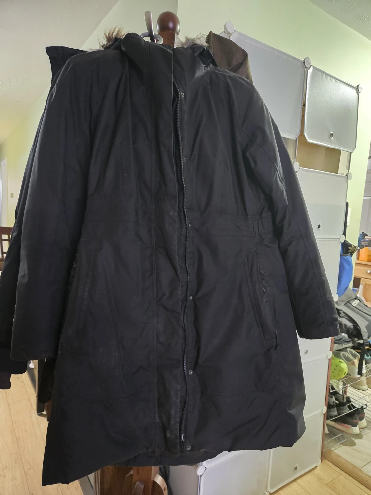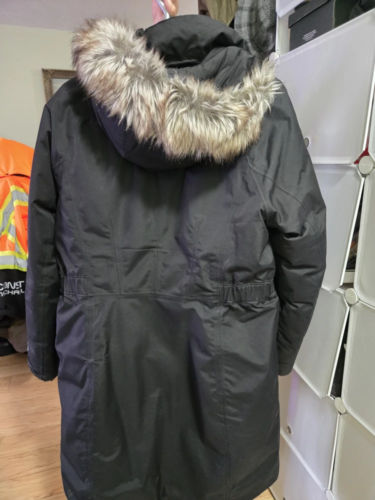 Selling a The North Face women's parka in size large. It's black and has a faux fur trim on the hood. There is some damage to the pocket as shown in the photos.