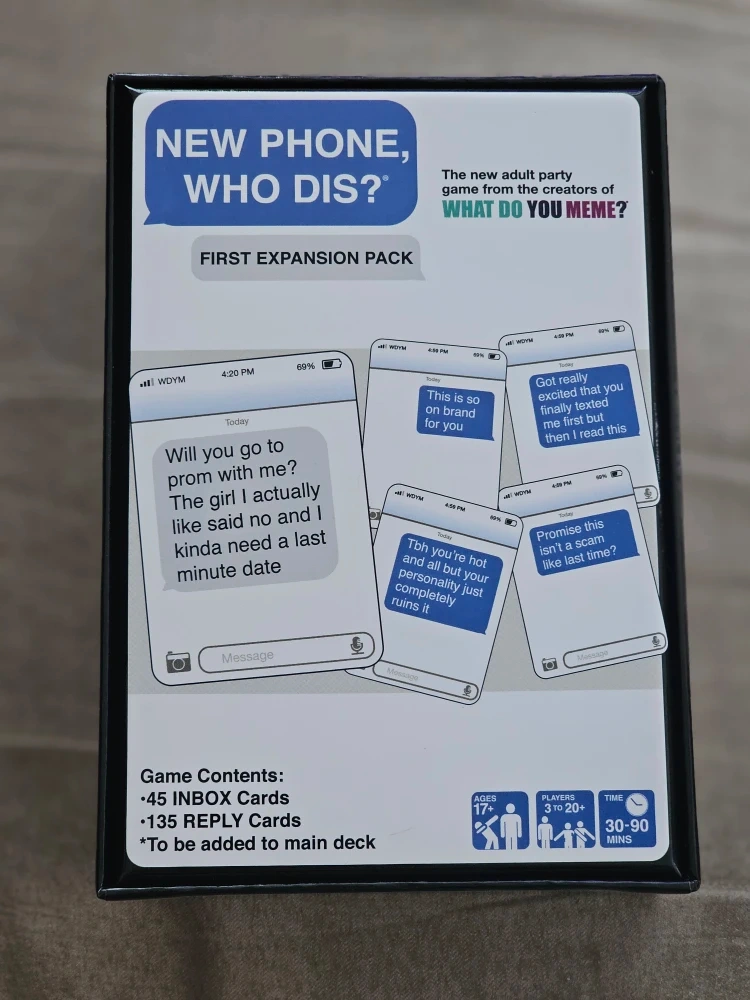 Selling a New Phone, Who Dis? First Expansion Pack card game! It's an adult party game from the creators of What Do You Meme? It was only played once and hasn't been touched since. Asking $15OBO as I paid close to $30 which is unbelievable and regret my decision to buy it at that price..