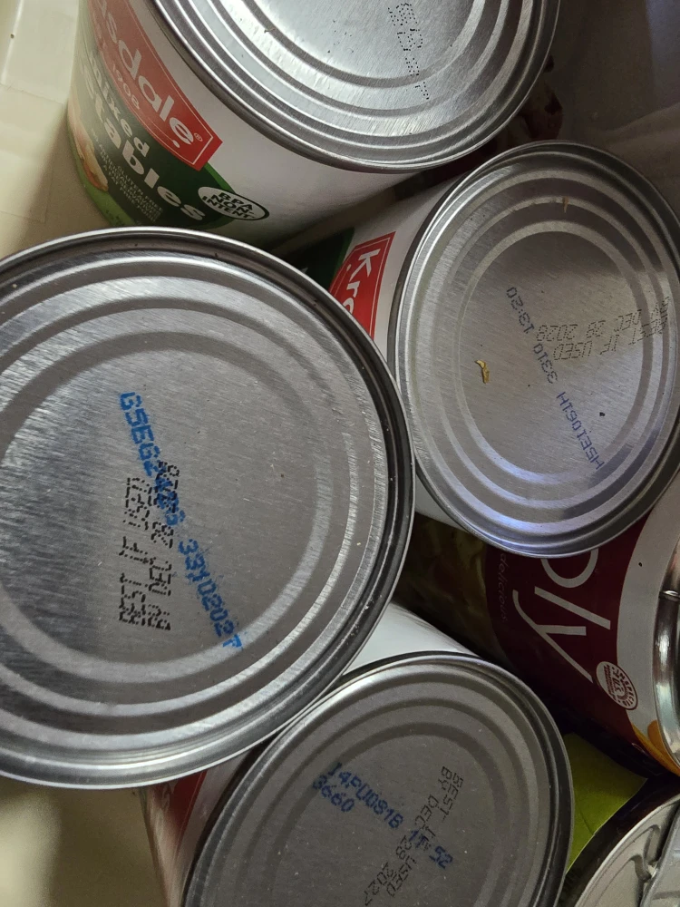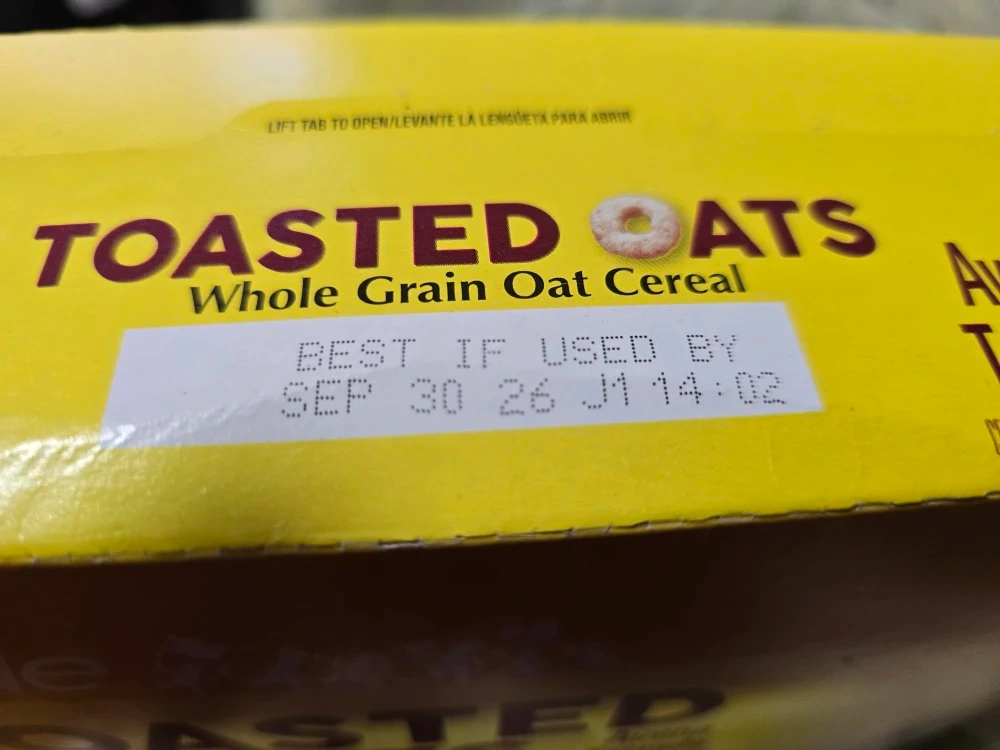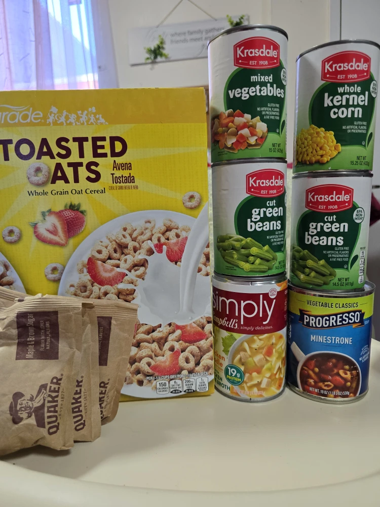 Gifting variety of canned goods and a box of Toasted Oats whole grain oat cereal. The Krandale mixed vegetables, whole kernel corn, and cut green beans are gluten-free. Also included is Simply Campbell's vegetable classics Progresso minestrone soup and Quaker Oats maple brown sugar.