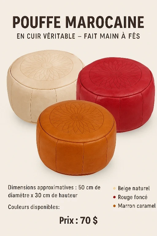 Add a touch of Moroccan style to your home with this beautiful leather pouf! It's handmade in Fès from genuine leather. Available in natural beige, dark red, caramel brown and Black