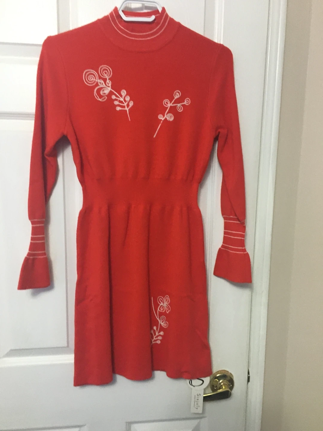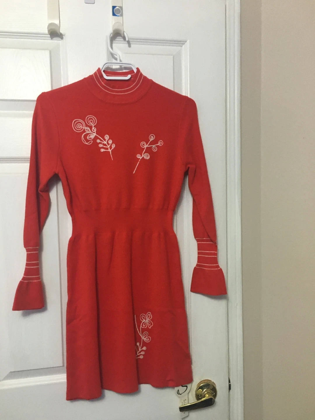 I'm selling a cute red long-sleeve dress from Sisjuly. It features a retro style with white floral embroidery. It's in great condition and ready for a new owner!