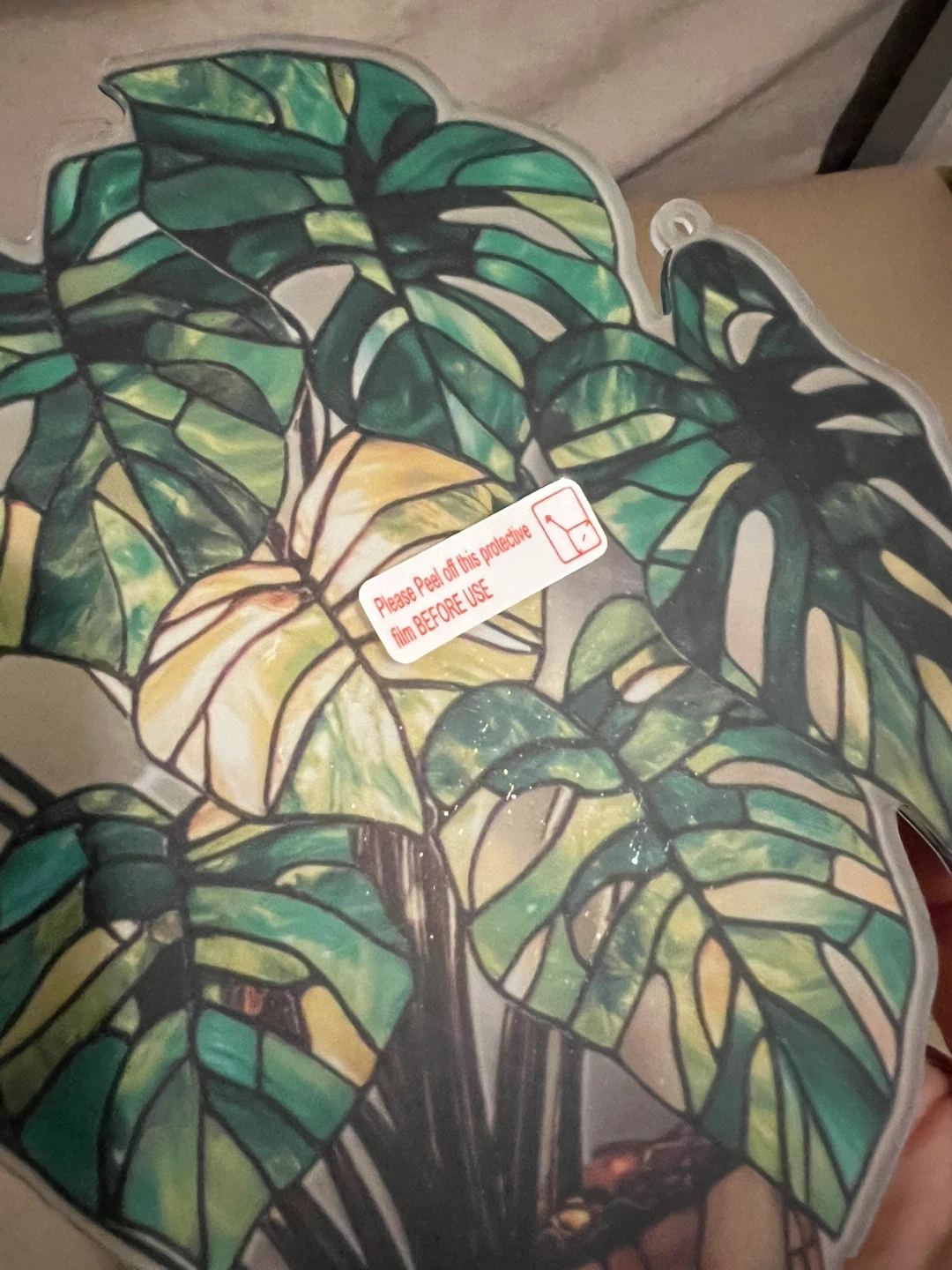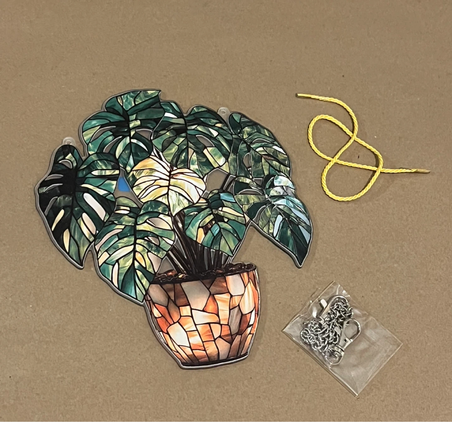 This is a brand new monstera sun catcher with a stained glass aesthetic. Looks a bit matte in the photos because the protective film has not been peeled off. Has two hooks on it and both a yellow string and a silver chain to choose from for hanging it up.